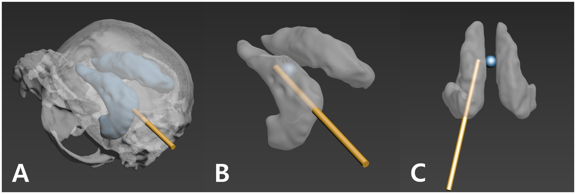 Figure 2. Three criteria for planning the ventricular catheter trajectory. A 1.2 mm gold cylinder was used to simulate the catheter path during planning. (A) The trajectory is directed away from the ventricle wall (the gold cylinder is not visible through the ventricle wall). (B) The catheter’s perforated segment is inserted as far into the ventricle as possible. (C) The catheter tip is positioned as close as possible to the foramen of Monro (blue sphere; reference point).