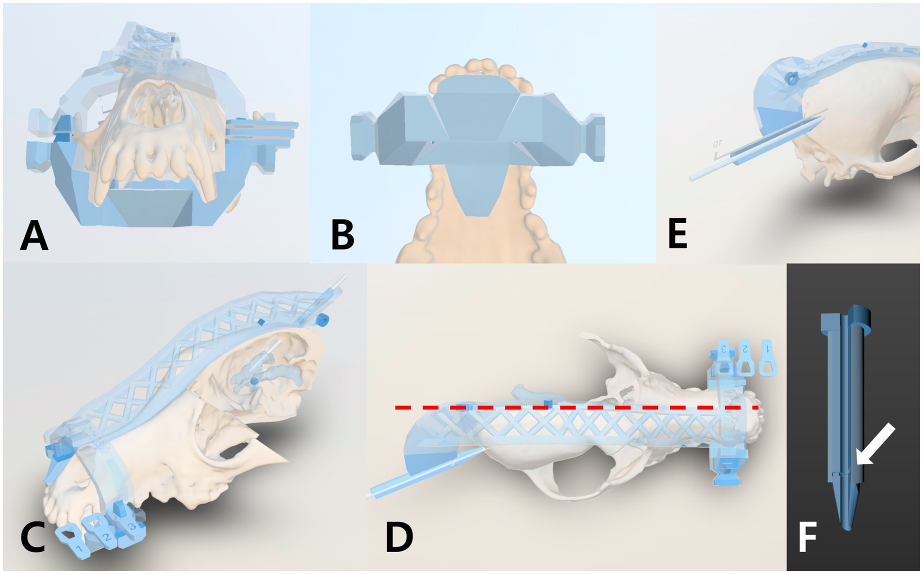 Figure 3. Design Features of the Patient-Specific 3D Guiding System. The system consists of an anchor guide and a midline guide. (A) Front view of the anchor guide, which fits over the first premolar and canine teeth on both sides. (B) Ventral view of the anchor guide in contact with the canine teeth and surrounding palatine bones. (C) Oblique front view of the midline guide contoured to the nasal, frontal, and parietal bones. (D) Dorsal view of the midline guide aligned with the skull midline (red dash line). (E) The posterior end of the midline guide functions as a sliding support, with its tip maintaining contact with the bone surface. (F) A marking line (white arrow) on the guide aligns with the 5 cm mark on the catheter, ensuring the planned insertion depth.