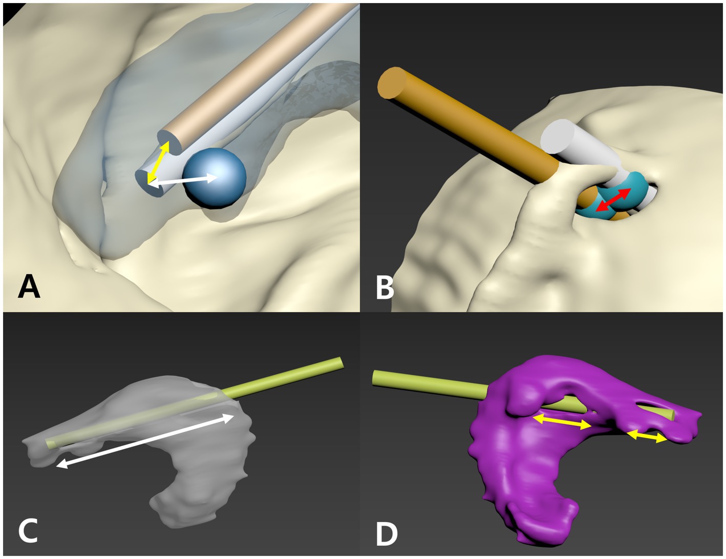 Figure 4. Methods for measuring parameters to assess ventricular catheter placement. (A) Planned trajectory (gold cylinder) and actual catheter (white cylinder) reconstructions with the foramen of Monro (FM) marked by a blue sphere. The distance from the catheter tip to the FM (white arrow) is the DFM, and the tip placement error is shown by the yellow arrow. (B) At the skull entry point, blue spheres mark the planned and actual catheter positions; the distance between them (red arrow) is the entry point error. (C) The inserted catheter (yellow-green cylinder) is used to measure the intraventricular insertion length (IIL, white arrow). (D) The portion of the catheter’s perforated tip in contact with the ventricular wall is measured as a fraction of the perforated tip length, defining the ventricular wall contact length (VVL).