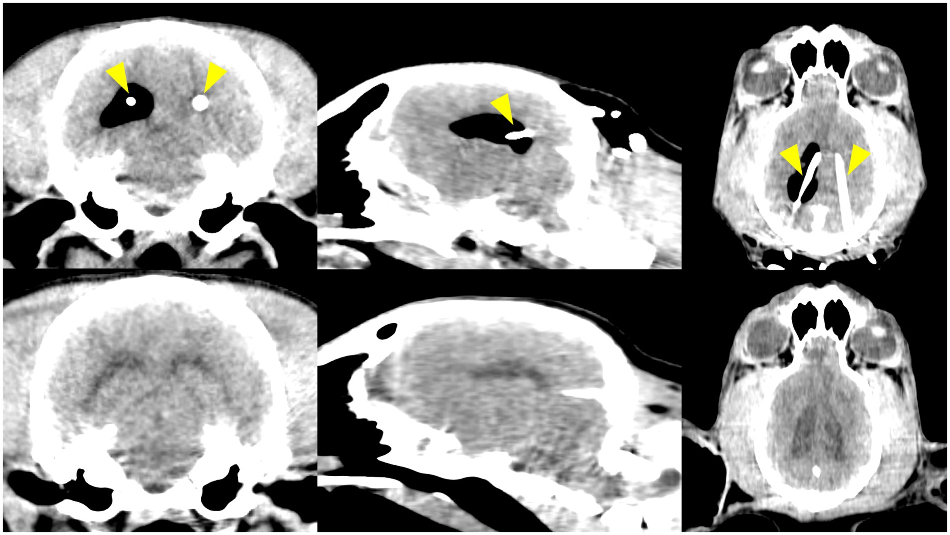 Figure 5. Pneumoventricle was observed as a postoperative complication in the first beagle. Top row: Immediate postoperative CT images (transverse, parasagittal, and dorsal views) show air in a mildly dilated right lateral ventricle, while the left ventricle is collapsed. The ventricular catheters are indicated by yellow arrowheads. Bottom row: CT images at 2 months post-surgery show resolution, with both lateral ventricles returned to normal size and no residual air.