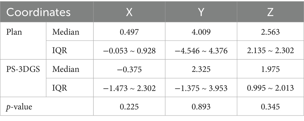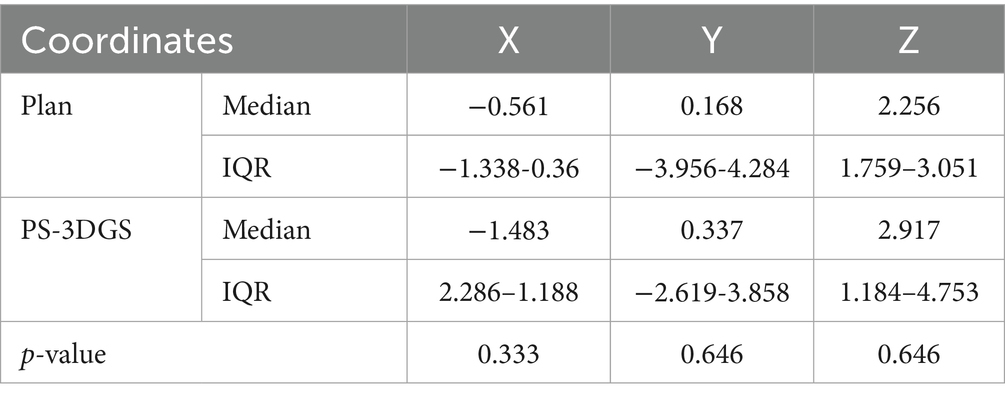 In the electrode study, the overall mean placement error was 4.6 ± 1.5 mm when targeting the anterior thalamus and hippocampus using a frameless stereotactic system (37). In another study using a 3D guide for brain biopsy, stereotactic accuracy was higher, with a mean error of 1.68 mm (range 0.82–3.16 mm) (38). In our study, the tip placement error was 2.81 ± 1.06 mm in the ex vivo phase and 6.16 mm (IQR 3.04–6.63 mm) in the in vivo phase, values somewhat larger than those reported in previous stereotactic studies. However, unlike those studies, the accuracy of ventricular catheter placement should not be judged solely by the stereotactic precision of the tip position. Importantly, we adopted DFM as the primary accuracy metric, which did not differ significantly between the planned and neuronavigation groups, and all perforated catheter segments were consistently located within the ventricles. Taken together, although the stereotactic accuracy of tip placement in our study appeared lower, the overall accuracy of ventricular catheter placement—when assessed using multiple functional parameters such as DFM, entry point error, IIL, and VVL—was comparable to that of the planned and neuronavigation groups. Moreover, considering that clinical hydrocephalic patients typically present with ventriculomegaly, the applicability of PS-3DGS in practice may be even more favorable.