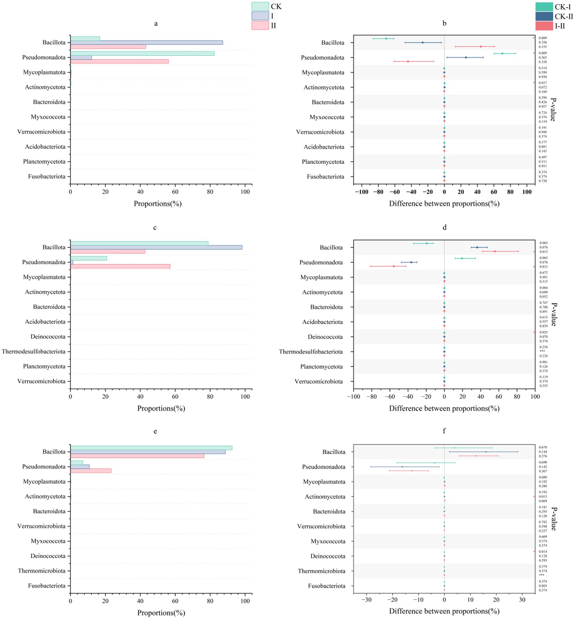 Figure 1. Effect of LAB on the microbial phylum level of strawberry vines silage over time. (a,c,e) Phylum-level microbial composition of strawberry vines silage on days 3, 7, and 45. (b,d,f) Differences in phylum-level microbial communities of strawberry vines silage on days 3, 7, and 45.