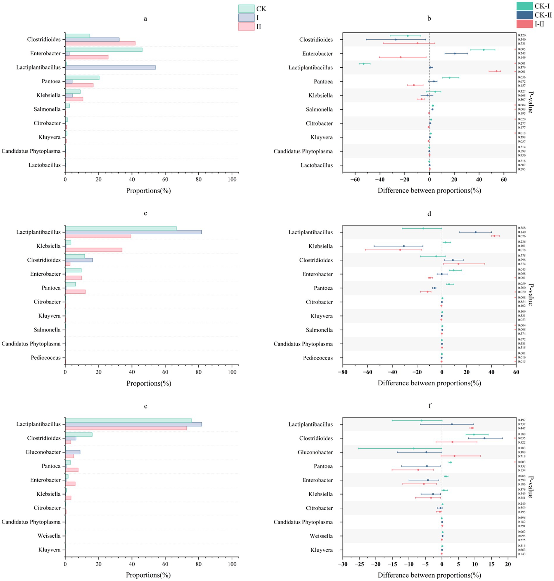 Figure 2. Effect of LAB on the microbial genus level of strawberry vines silage over time. (a,c,e) Genus-level microbial composition of strawberry vines silage on days 3, 7, and 45. (b,d,f) Differences in genus-level microbial communities of strawberry vines silage on days 3, 7, and 45.