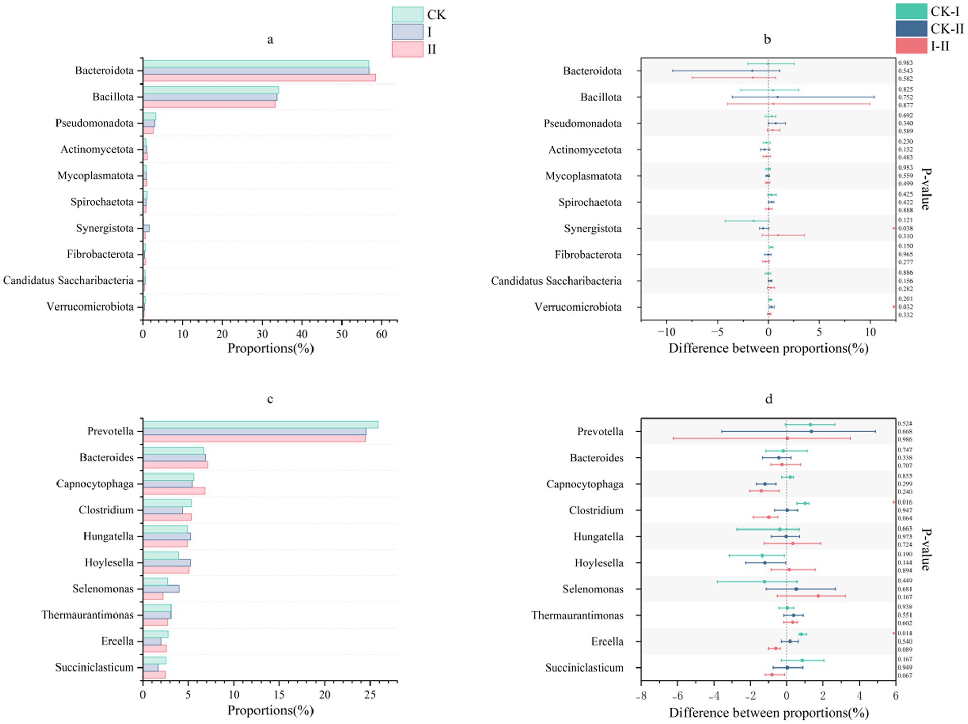 The phylum-level composition of ruminal microbiota in Hu sheep is illustrated in Figures 3a,b. In the present study, Bacteroidota and Bacillota were the dominant phyla across all groups, with no significant intergroup differences observed. Genus-level microbial profiles of ruminal fluid, presented in Figures 3c,d, reveal predominant genera including Prevotella, Bacteroides, Capnocytophaga, and Clostridium. Compared to the CK group, both experimental groups exhibited a reduction in Prevotella abundance, although no inter-experimental group differences were observed.