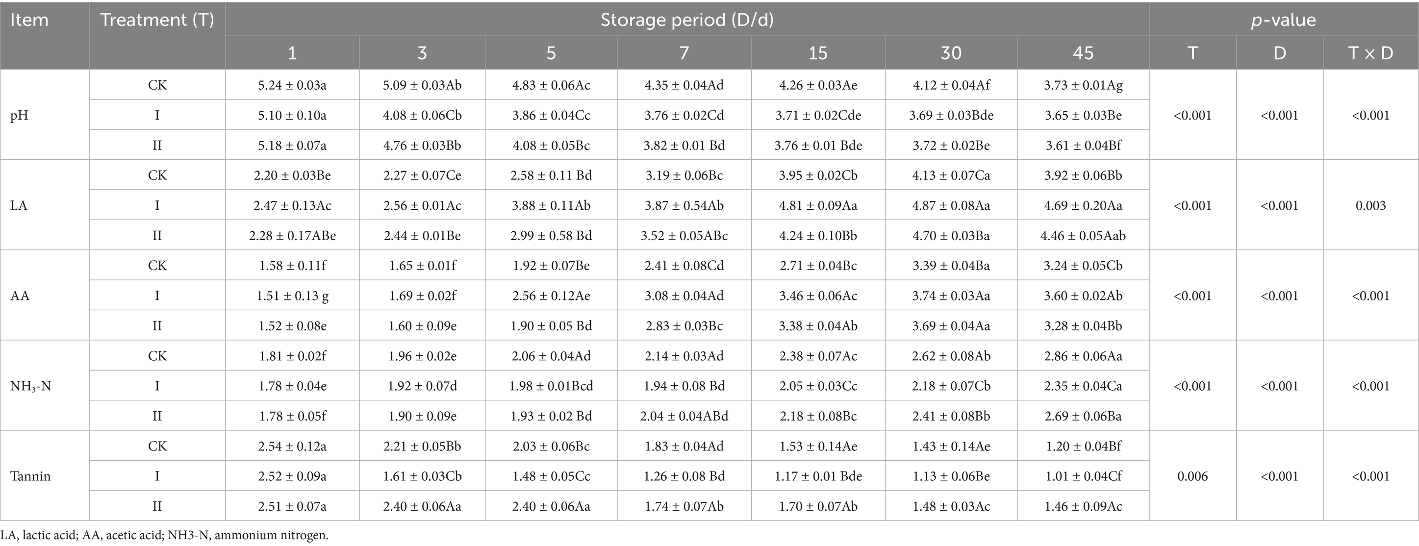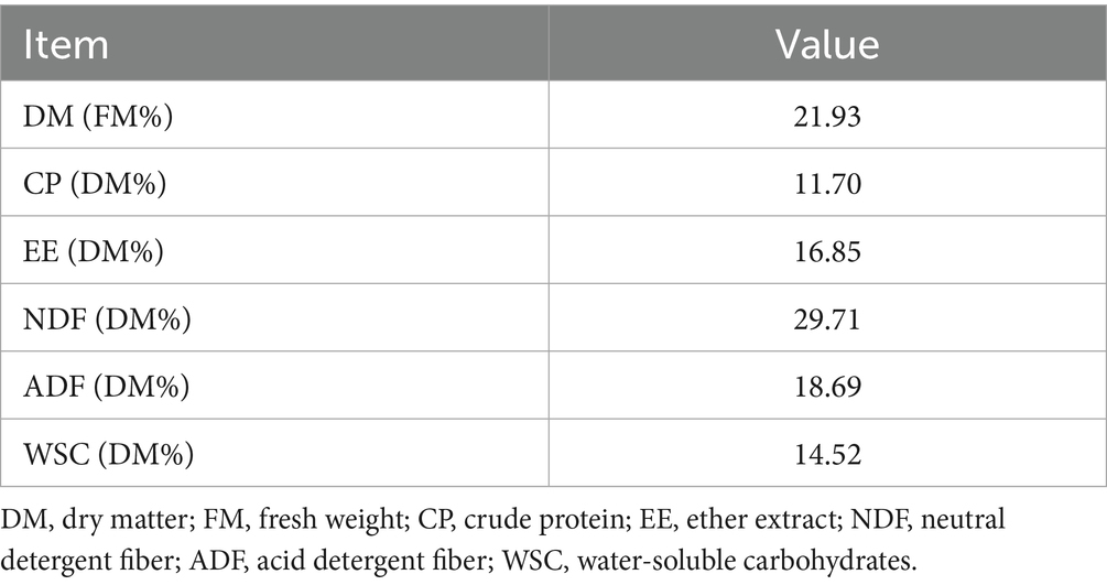 For pH measurement, 10 g of silage was mixed with 90 mL of distilled water, extracted at 4 °C for 24 h, and filtered through four layers of gauze. For organic acid analysis, 20 g of silage was homogenized with 180 mL of ultrapure water, filtered through quantitative filter paper and 0.45 μm cellulose ester membranes, and analyzed for LA and AA using high-performance liquid chromatography (HPLC), following the method described by Wang et al. (6). NH₃-N was quantified according to the method of Broderick and Kang et al. (12). The DM content of both silage and apparent digestibility was determined using the oven-drying method according to AOAC standards (13). The CP content of silage and apparent digestibility was analyzed using a fully automated Kjeldahl nitrogen analyzer following AOAC standards (13). Meanwhile, the NDF and ADF contents of silage and apparent digestibility were determined using the methods described by Van Soest et al. (14). EE was determined following GB/T 6433-2006 (15); and WSC was quantified using the Abbkine Soluble Sugar Assay Kit (Abbkine Scientific Co., Ltd., KTB1320). Tannin content was assessed using the Abbkine Tannin Content Assay Kit (Abbkine Scientific Co., Ltd., KTB1541).