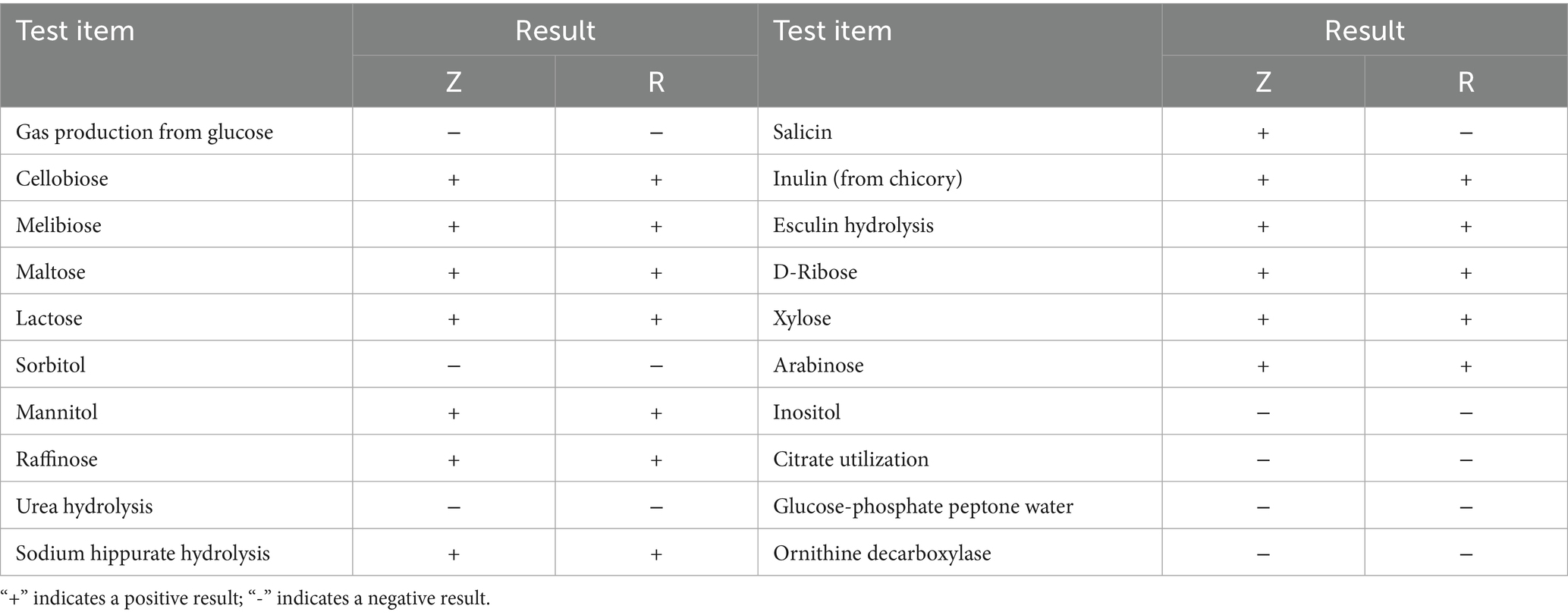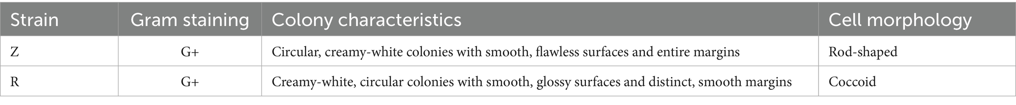 To mitigate tannin-mediated inhibition of LAB activity, we isolated two LAB strains (designated Z and R) from strawberry vines. Their morphological characteristics, Gram staining results, and cellular morphology are detailed in Table 3, while their physiological and biochemical profiles are presented in Table 4. Carbon utilization assays revealed comparable metabolic capabilities between strains Z and R across most substrates, with the notable exception of salicin metabolism, which was unique to strain Z and absent in strain R. 16S rRNA gene sequencing, conducted via PCR amplification followed by BLAST alignment, confirmed 99.39% sequence homology between strain Z and L. plantarum, while strain R exhibited 99.57% homology with L. lactis. An integrative analysis of morphological and molecular data conclusively identified strain Z as L. plantarum and strain R as L. lactis.
