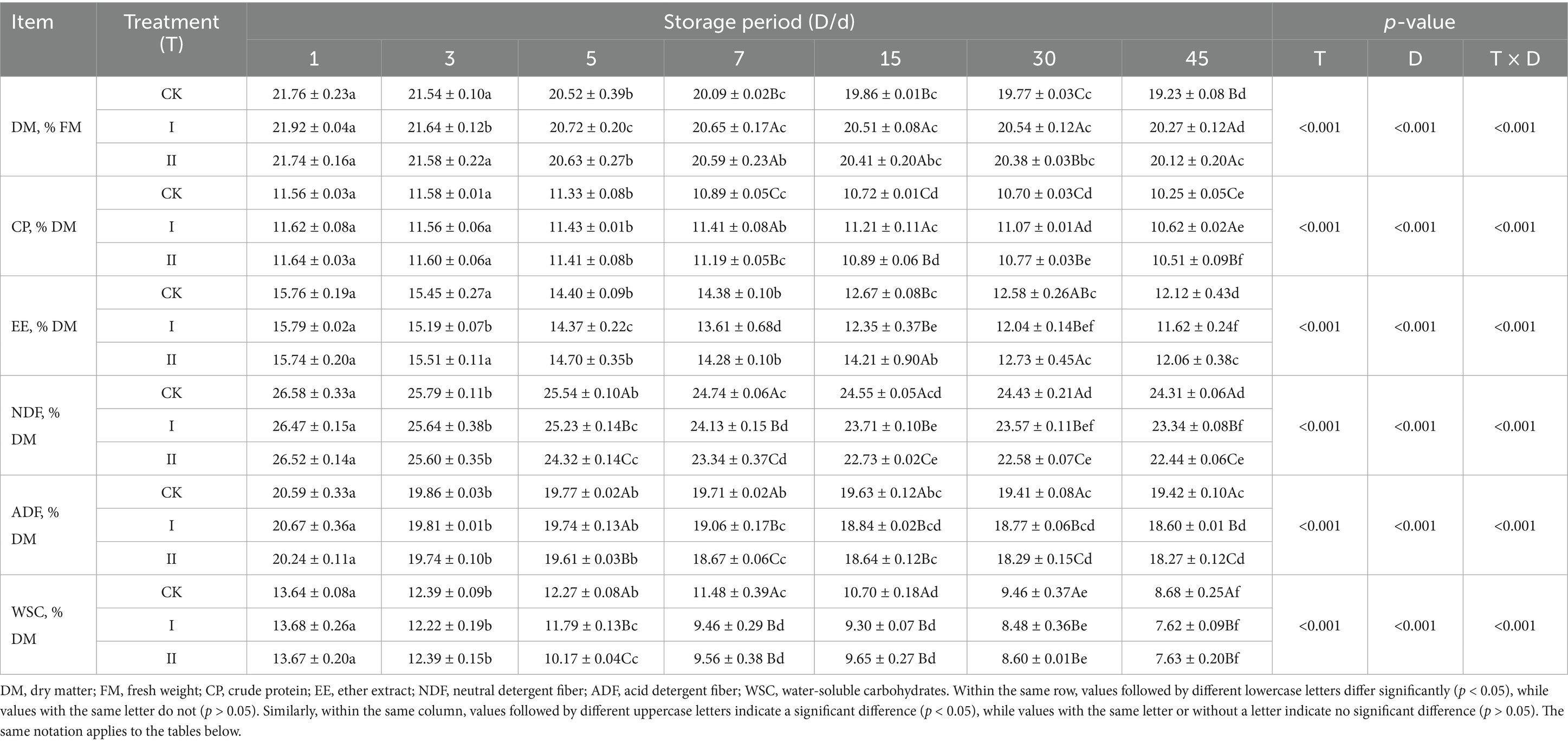 Borreani et al. demonstrated that aerobic respiration during ensiling results in varying degrees of DM loss in forage (9), with lower WSC content exacerbating this depletion. In the present study, the relatively high WSC content in strawberry vines provided sufficient substrate for LAB fermentation, which rapidly lowered pH and effectively preserved DM content. After 45 days of ensiling, both experimental groups showed significantly lower WSC content and higher DM content compared to the CK group, consistent with the findings of Liu et al. (21). Moreover, both experimental groups showed significantly higher CP content than the CK group at 45 days, indicating that LAB additives effectively inhibited protein degradation, in agreement with the conclusions of Khota et al. (22). Han et al. reported that post-harvest plant lipases decompose lipids into glycerol and free fatty acids, with high moisture content accelerating this process (23). In the present study, the rapid pH reduction observed in Group I may also be associated with LA production via glycerol metabolism mediated by L. plantarum. Zhang et al. suggested that LAB metabolism during ensiling degrades NDF and ADF (24). The present study observed similar degradation patterns for NDF and ADF during fermentation, with experimental groups showing significantly lower values than the CK group (p < 0.05).