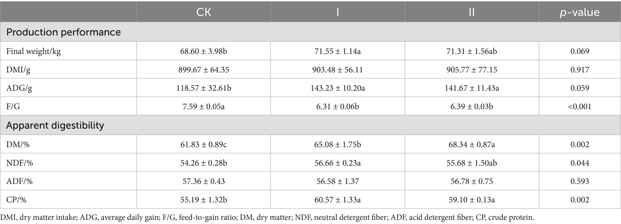 The effects of strawberry vines silage on production performance and apparent digestibility in Hu sheep are presented in Table 7. In this study, supplementation with LAB-fermented silage resulted in a significantly higher final body weight in Group I compared to the CK group (p < 0.05). Both experimental groups demonstrated significantly improved ADG and reduced F/G relative to the CK group (p < 0.05), although no significant differences were observed in DMI.