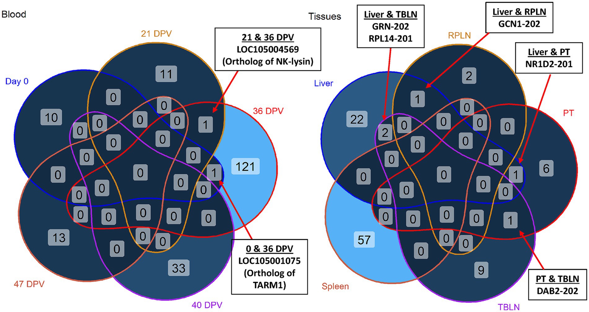 Figure 4. Venn diagrams of differentially expressed transcripts (DETs). Shared and unique DETs across day 0, 21 days post-vaccination (DPV), 36 DPV, 40 DPV, 47 DPV. Shared and unique DETs across liver, retropharyngeal lymph node (RPLN), palatine tonsil (PT), tracheobronchial lymph node (TBLN), and spleen. Shared DETs are indicated by arrows. TARM1 = T cell-interacting, activating receptor on myeloid cells 1; GRN = granulin precursor; RPL14 = ribosomal protein L14; GCN = GCN1 activator of EIF2AK4; NR1D2 = nuclear receptor subfamily 1 group D member 2; DAB2 = DAB adapter protein 2. The samples were collected from unvaccinated control (n = 4) and vaccinated (n = 5) animals.