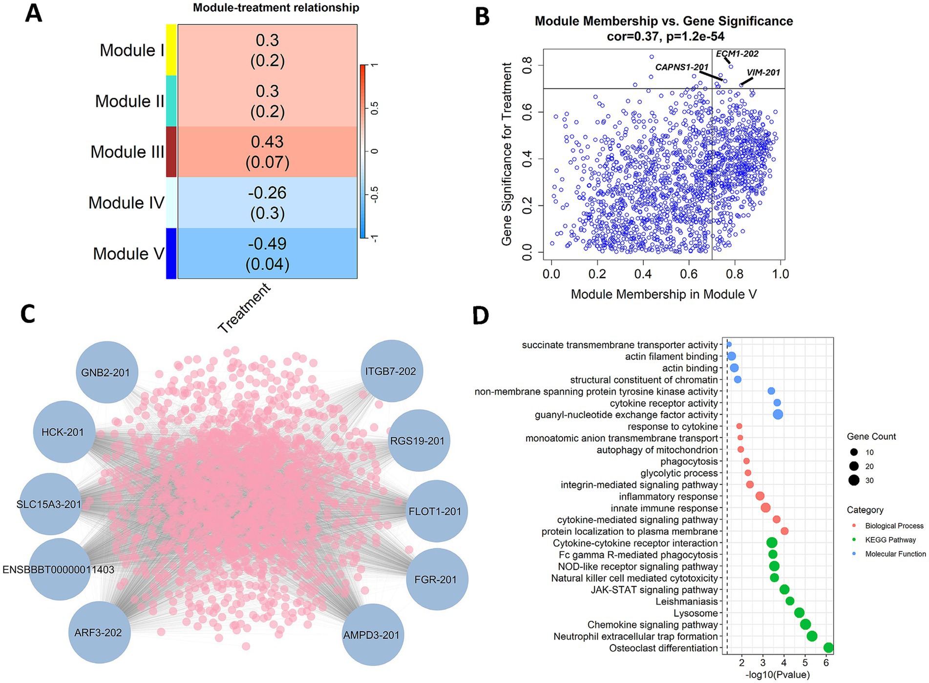 Figure 7. Weighted gene co-expression analysis (WGCNA) reveals co-expression at 40 days post vaccination (DPV) and 47 DPV. (A) Module treatment correlation matrix displaying identified modules of co-expressed transcripts. (B) Correlation between module membership and gene significance for Module V transcripts. Transcripts with a module membership and significance greater than 0.7 are highlighted. (C) Top 10 transcripts with high connectivity to the expression of other transcripts in Module V. (D) Enrichment of Module V co-expressed transcripts in biological processes, KEGG pathways, and molecular functions. The samples were collected from unvaccinated control (n = 4) and vaccinated (n = 5) animals.