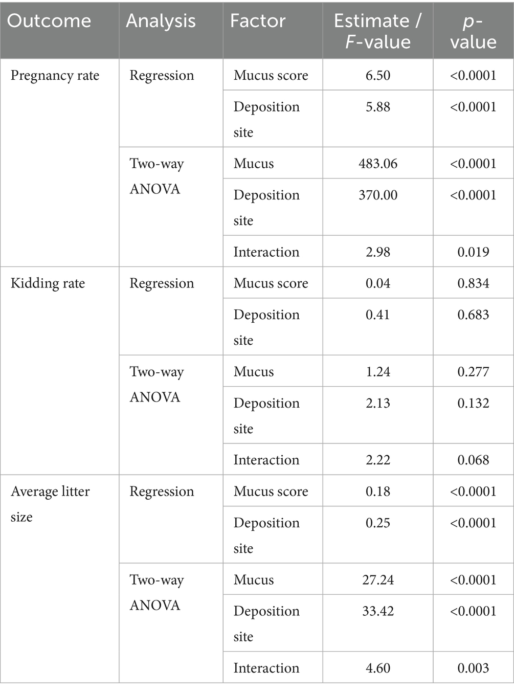 Our factorial analysis revealed that semen deposition site and mucus characteristics act synergistically to determine fertility outcomes. Both pregnancy rate and litter size were significantly influenced by the combination of these two variables, while kidding rate remained unaffected.