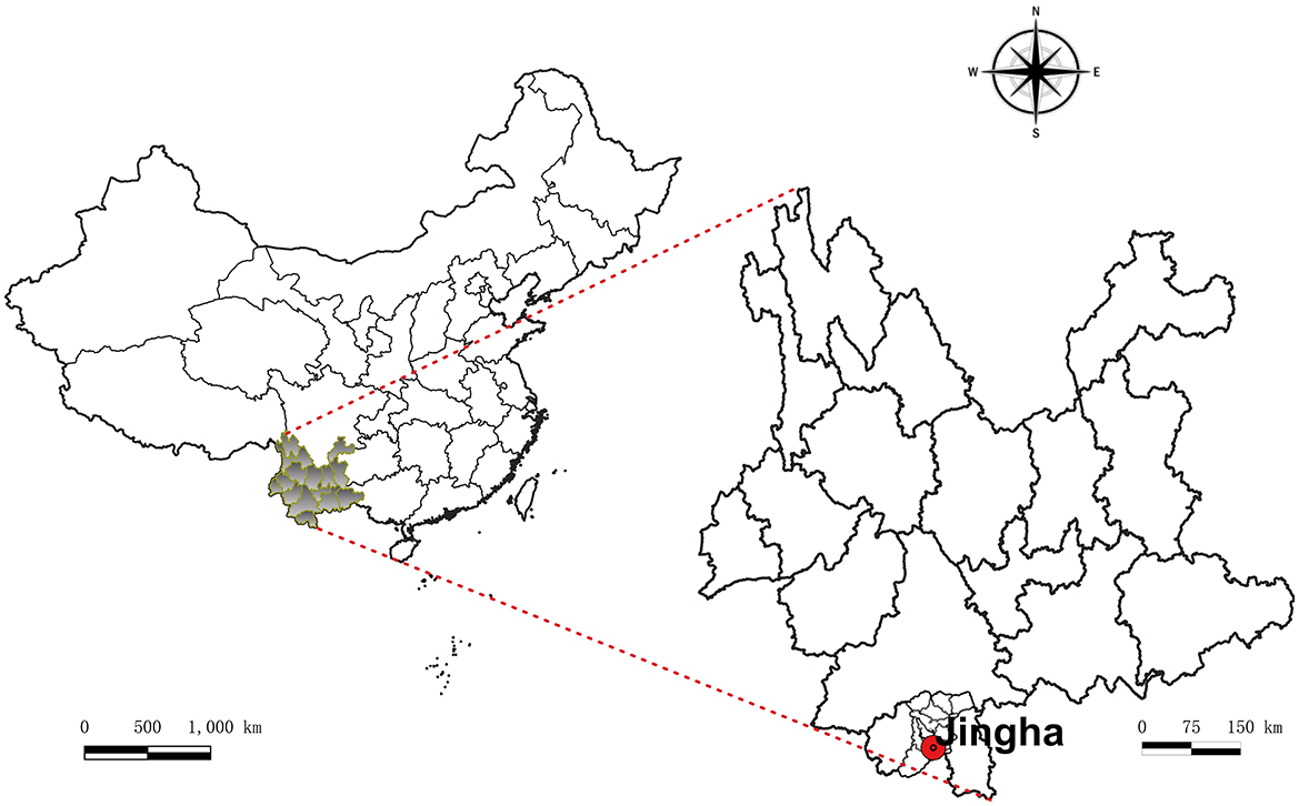 Figure 1. Location map of Jingha survey site in Jinghong County, Xishuangbanna Prefecture, southern Yunnan, China (April 2016–March 2017).