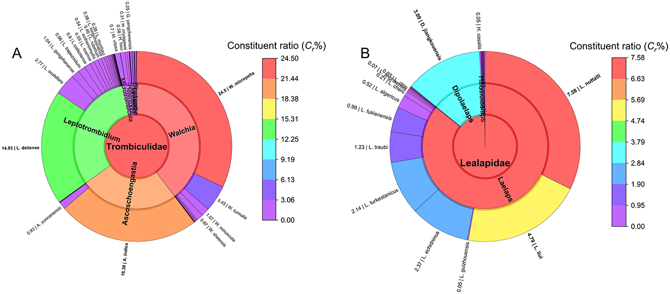 Figure 2. The composition of two mite groups at Jingha in southern Yunnan of southwest China (April 2016–March 2017). (A) The constituent ratios (Cr) of family, genus and species of chiggers (chigger mites); (B) The constituent ratios (Cr) of family, genus and species of gamasid mites.