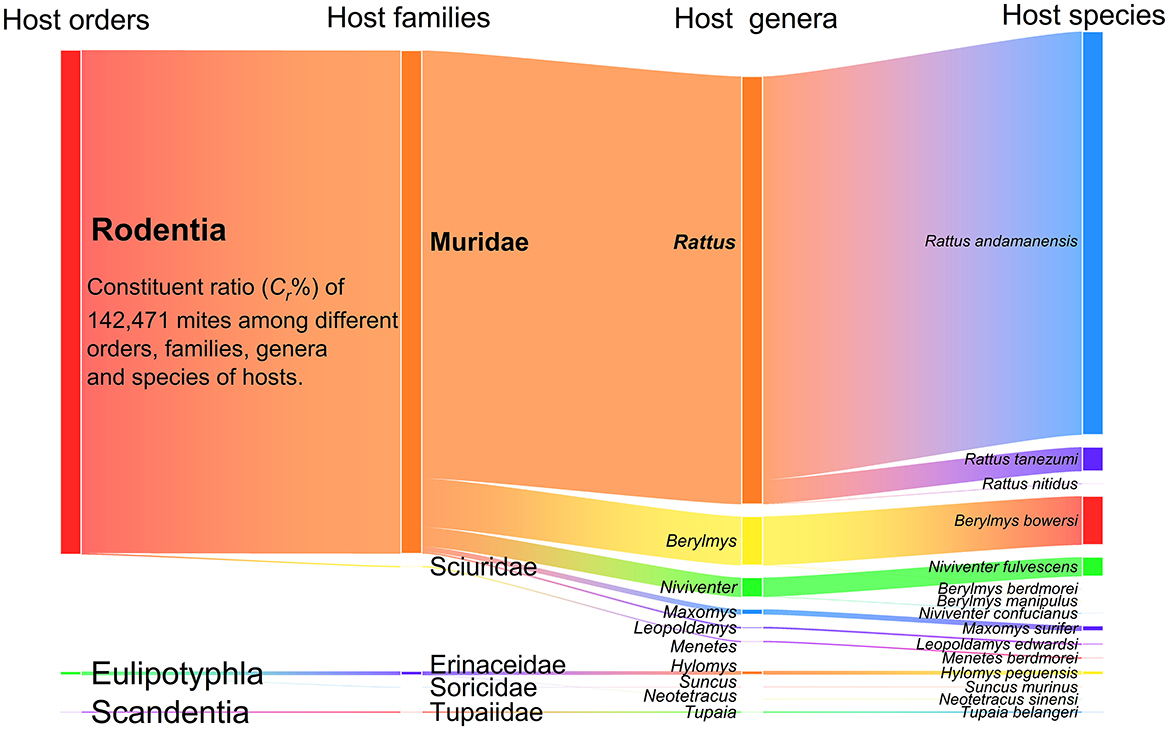 Figure 3. Visualization of mite distribution among different orders, families, genera and species of small mammal hosts at Jingha survey site in southern Yunnan of southwest China (April 2016-March 2017).