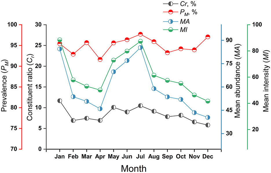 Methods: We calculated infestation metrics (prevalence [PM], mean abundance [MA], mean intensity [MI], constituent ratio [Cr]) and community indices (richness [R], Shannon-Wiener diversity [H], Pielou evenness [E], Simpson dominance [D]). Generalized additive models (GAMs) analyzed spatiotemporal and climatic patterns.