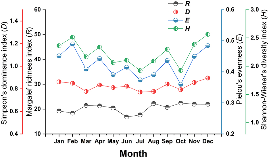 The diversity indices of the mite community in each month also showed varying degrees of fluctuations. Shannon-Wiener diversity (H) and Pielou's evenness (E) showed two minor peaks in February and December, with low ebbs occurring in October. Margalef's richness (R) and Simpson's dominance (D) slight fluctuates in different months without an obvious pattern (Figure 5).