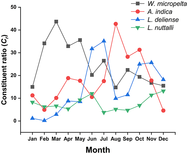 The monthly fluctuated values of Cr ranged from 5.81% (December) to 11.67% (January), peaking in January. The values of PM fluctuated between 91.63% (April) and 97.71% (July), with marginally elevated values in summer (July) and winter (December), but no pronounced peak. The MA varied from 40.41 (December) to 85.32 (July), exhibiting distinct bimodal peaks in July and December. Similarly, MI ranged from 41.63 (December) to 88.46 (January), with analogous bimodal peaks during July and December (Table 6, Figure 4).