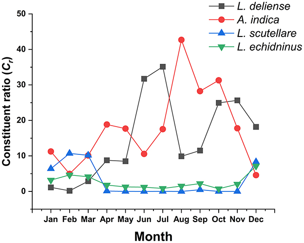 The three chigger (L. deliense, A. indica, L. scutellare) and one gamasid (L. echidninus) vector species varied significantly in monthly constituent ratios (Cr), with L. deliense and A. indica demonstrating the most substantial fluctuations. Leptotrombidium deliense showed bimodal peaks (summer primary peak: June-July; autumn secondary peak: October–November). Ascoschoengastia indica peaked in late summer (August: Cr = 42.69%, 5,556/13,016), while both L. scutellare and L. echidninus exhibited minor and indistinct peaks during December (Figure 7).