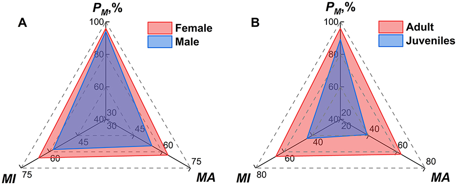 Figure 8. Radar chart visualization of mite infestation indexes on different sexes and ages of small mammal hosts at Jingha survey site in southern Yunnan of southwest China (April 2016–March 2017).