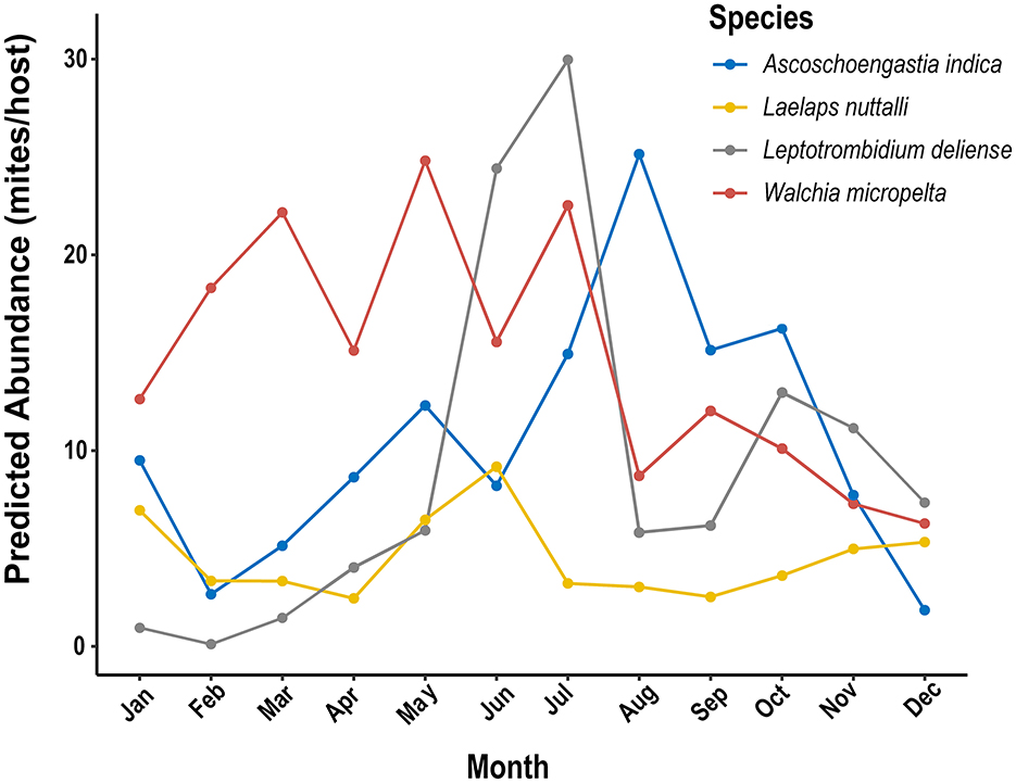GAMs further revealed the response heterogeneity of different mite species to climates. The abundance of A. indica showed an exponential growth with the increase of precipitation and reached 25.1 mites/host (95% CI: 24.5–25.8) when the precipitation was >150 mm/month, which was 7.4 times that in the dry season when the precipitation was <50 mm. Leptotrombidium deliense showed a strong adaptability to the high temperature and humidity in summer with the highest peak of mite abundance in July. Laelpas nuttalli, however, had an inapparent seasonal fluctuation of mite abundance, and it showed a strong tolerance to different types of climates all the year round (Figures 9, 10).