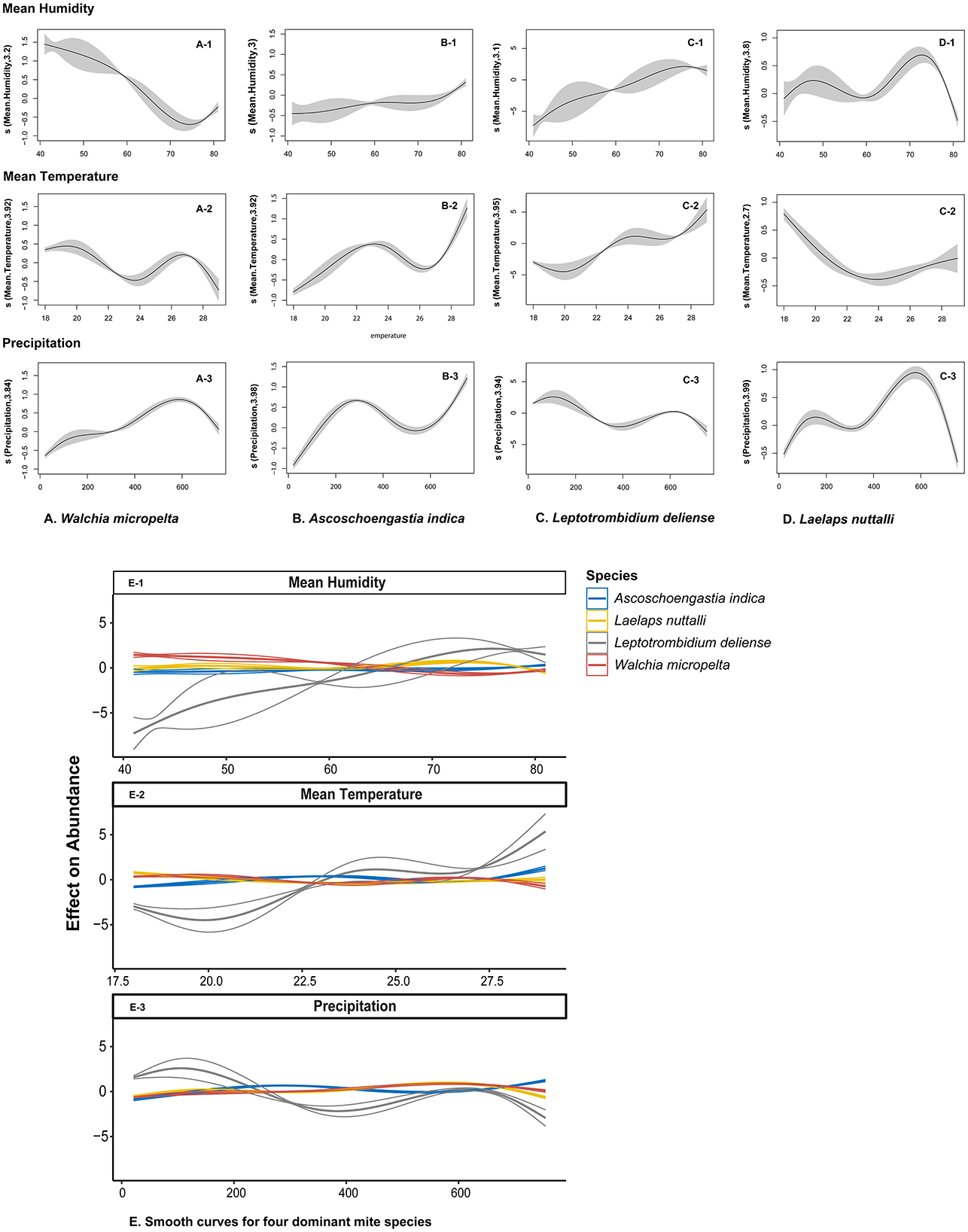 Figure 10. Non-linear effect of climate factors on mite abundance of four dominant mite species at Jingha survey site in southern Yunnan of southwest China (April 2016–March 2017). The curves were fitted with generalized additive models (GAMs), in which the shaded area represents 95% confidence intervals.