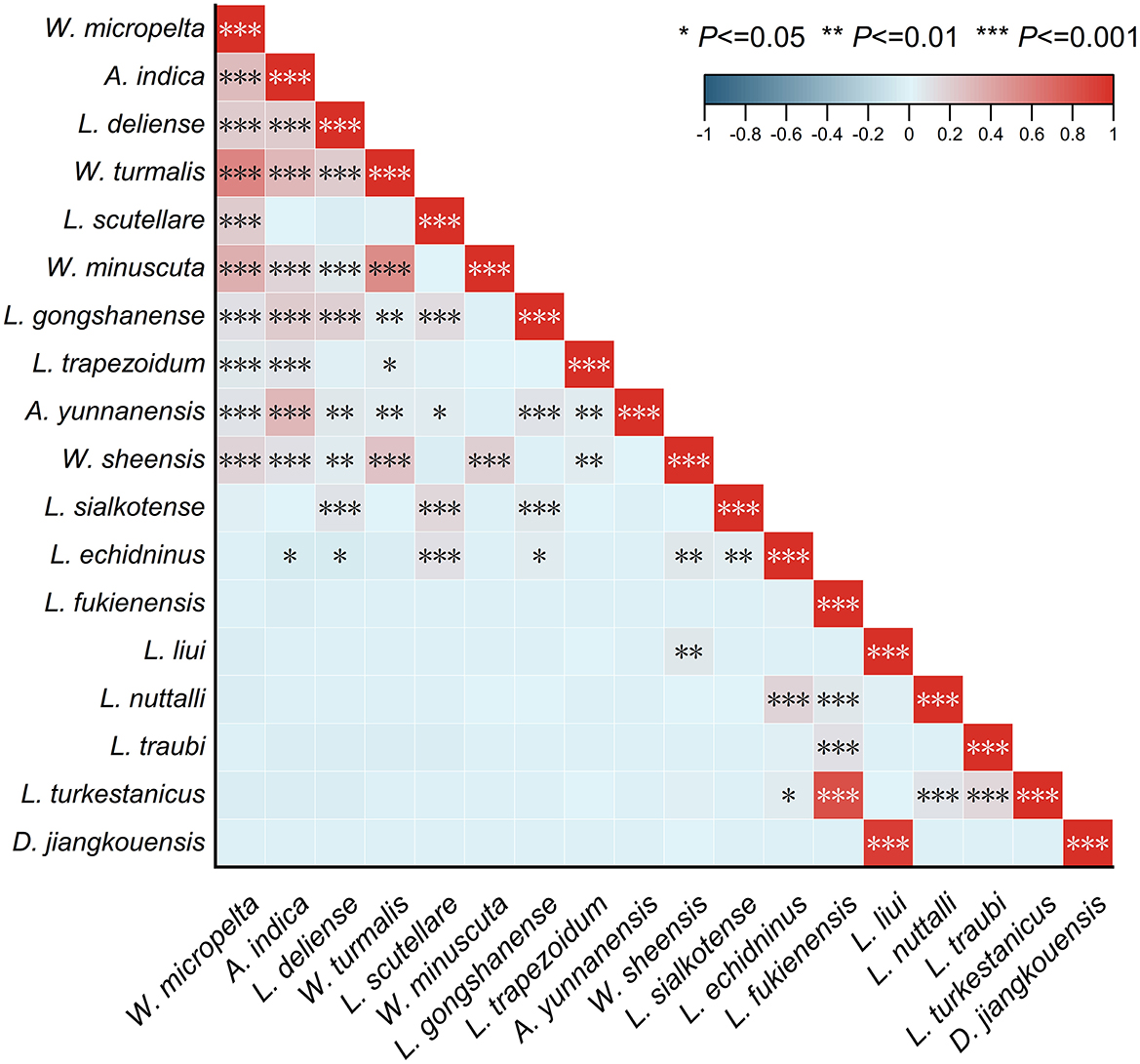 Figure 11. Heat map visualization for the relationship between any two of 18 main mite species at Jingha survey site in southern Yunnan of southwest China (April 2016–March 2017).