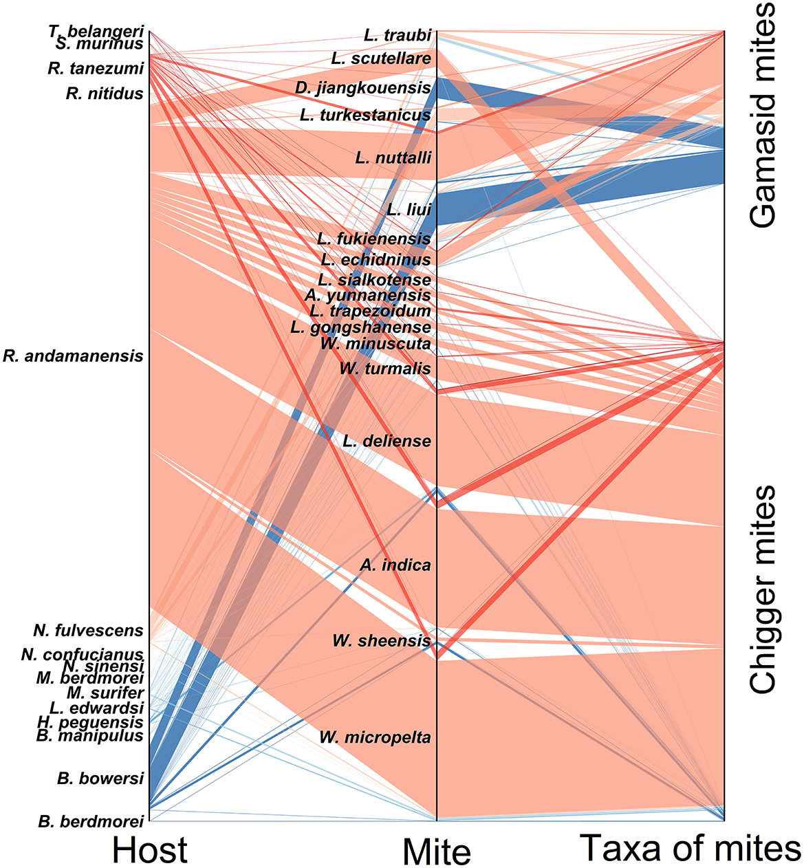 Parallel sets diagrams were employed to analyze interactions between mites and their hosts, focusing on dominant mite species with larger population sizes within the community. The analytical workflow comprised the following steps: