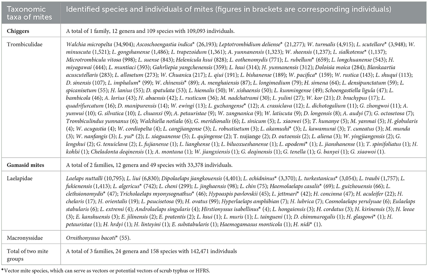 According to the hierarchical taxonomic levels (family, subfamily, genus, species), each mite specimen was ultimately identified to species using taxonomic keys and literature (42–44). Specimens unidentifiable to species due to damage, debris obstruction, ambiguous morphology or suspected new species were recorded as species inquirendae (sp. inq.) in original datasheets. All unidentified specimens were subsequently excluded from statistical analyses. Given the technical complexity of chigger and gamasid mite taxonomy, over 3,000 working hours of dedicated effort were devoted to identification, necessitating significant workload.