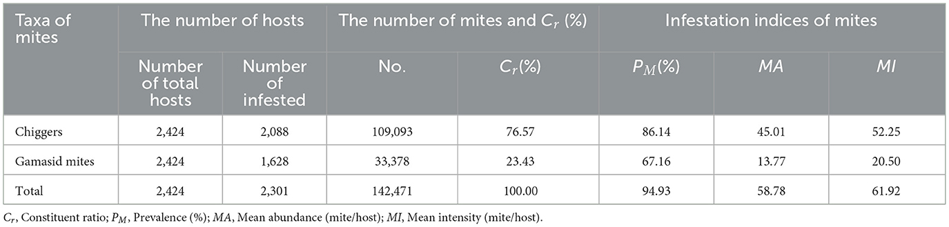 Of the 158 mite species and 142,471 individuals, chiggers accounted for 68.99% (109/158) of species composition and 76.57% (109,093/142,471) of abundance, outnumbering gamasid mites with 31.01% of species (49/158) and 23.43% of abundance (33,378/142,471; Table 3).