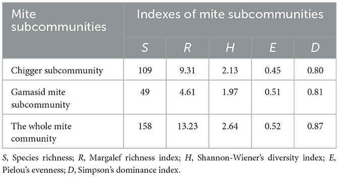 Mite community structure was quantified with Margalef richness index (R), Shannon-Wiener diversity index (H), Pielou's evenness index (E), and Simpson's dominance index (D). Subcommunity structures of chigger mites and gamasid mites were statistically compared.