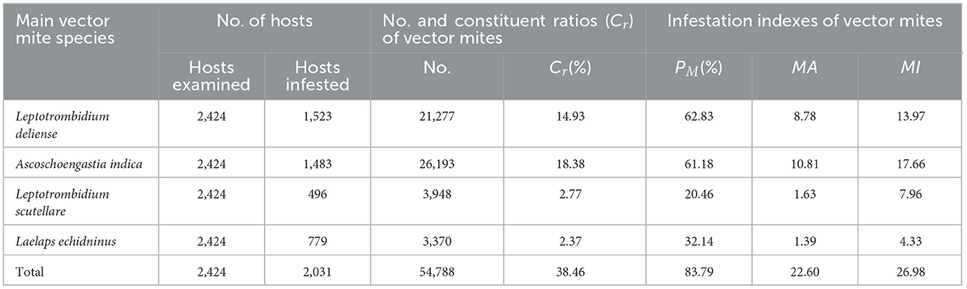 We documented four primary confirmed or putative vectors of zoonotic diseases in Jingha: three chigger species (L. deliense, A. indica, L. scutellare) and one gamasid mite species (Laelaps echidninus). These species collectively accounted for 38.46% (54,788/142,471) of all the 158 identified species (109 chigger mites + 49 gamasid mites). Among these four vector mite species, L. deliense (Cr = 14.93%, 21,277/142,471) and A. indica (Cr = 18.38%, 26,193/142,471) were the most abundant with high infestation indices (Table 5).