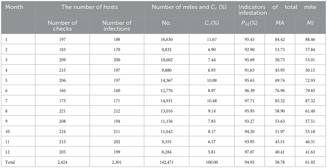 After taxonomic identification, a verified mite dataset was compiled. Standard statistics of mite parasitism including constituent ratios (Cr), prevalence (PM), mean abundance (MA), and mean intensity (MI) were calculated. Statistical significance tests were conducted with SPSS 26.0 (α = 0.05): Chi-square test for Cr and PM, and Non-parametric test (Mann-Whitney U or Kruskal-Wallis H) for MA and MI.