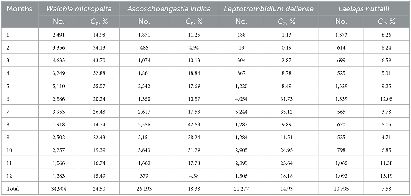 Table 7. Monthly variations of numbers and constituent ratios (Cr) of four dominant mite species at Jingha survey site in southern Yunnan of southwest China (April 2016–March 2017).