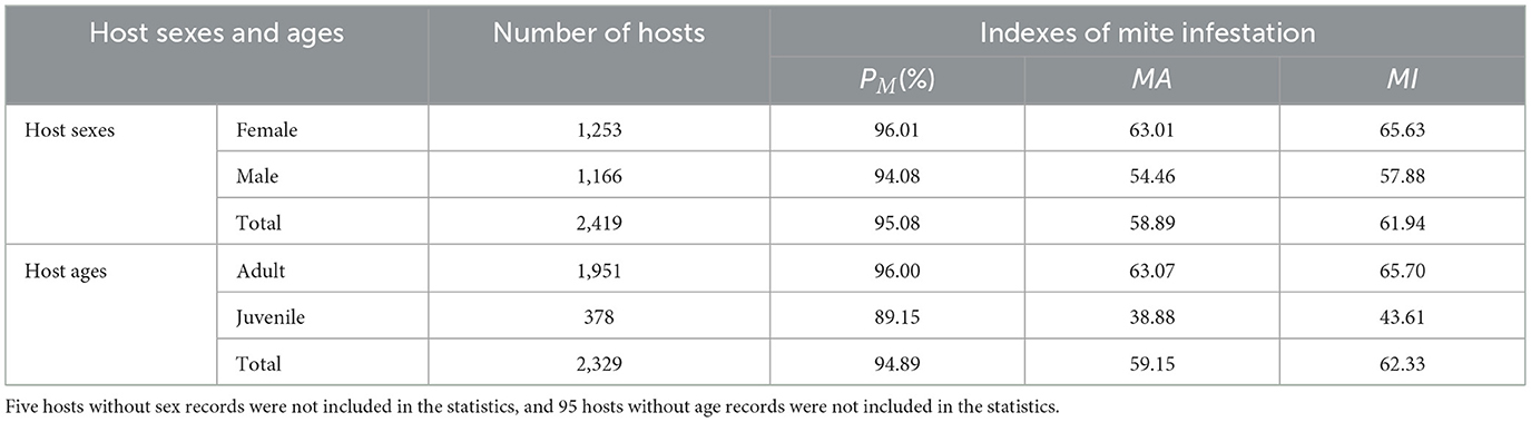 Host sexes and ages significantly influenced mite infestation patterns. Of the 2,424 hosts, five lacked sex data and 95 lacked age records, which were not included in the analysis of the present study. After the exclusion, the analysis included 2,419 hosts with sex records (1,253 female; 1,166 male) and 2,329 hosts with age records (1,951 adult; 378 juvenile). Female hosts exhibited significantly higher infestation indices than males (PM: 96.01% vs. 94.08%, χ2 = 4.80, P < 0.05; MA: 63.01 vs. 54.46, Z = −4.23, P < 0.001; MI: 65.63 vs. 57.88, Z = −3.68, P < 0.001; Table 8, Figure 8).