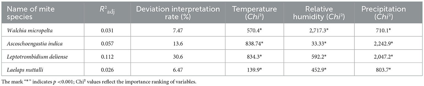 All parametric and smooth items were statistical significance (P < 0.001) in generalized additive models (GAMs) for the abundance of four dominant mite species: W. micropelta, A. indica, L. deliense, and L. nuttall. These outcomes demonstrating the substantial driving effect of climatic factors (monthly mean temperature, relative humidity, and precipitation) on mite abundance. The climatic driving effect on the seasonal dynamics of mites differed significantly depending on mite species. Leptotrombidium deliense exhibited the strongest climatic dependency with 30.6% of deviation interpretation rate (Table 9) and 73.4% of total accumulative contribution rate of climatic factors (28.1% of temperature contribution rate + 45.3% of precipitation contribution rate). Laelap nuttalli displayed minimal climatic responsiveness (6.47% of deviation interpretation rate).