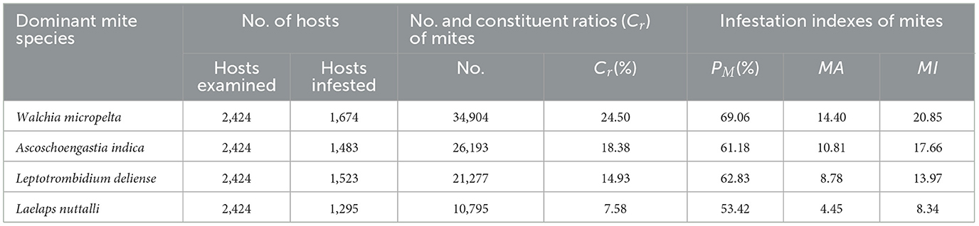 Four species (three from chigger subcommunity and one from gamasid subcommunity) exhibit dominance (Cr = 65.40%) in the combined mite community. In the chigger subcommunity, W. micropelta (Cr = 31.99%, 34,904/109,093), A. indica (Cr = 24.01%, 26,193/109,093), and L. deliense (Cr = 19.50%, 21,277/109,093) were the three dominant species. Their prevalence (PM) was 69.06%, 61.18%, and 62.83%, respectively, with high mean abundance (MA = 14.40; 10.81; 8.78) and mean intensity (MI = 20.85; 17.66; 13.97). In the gamasid subcommunity, Laelaps nuttalli was the predominant species, comprising 32.24% of all gamasid mites (Cr = 32.24%, 10,795/33,378), with PM = of 53.42%, MA = 4.45, and MI = of 8.34. The dominating chigger species showed higher constituent ratio (Cr) and infestation indices (PM, MA, MI) than the dominating gamasid species.