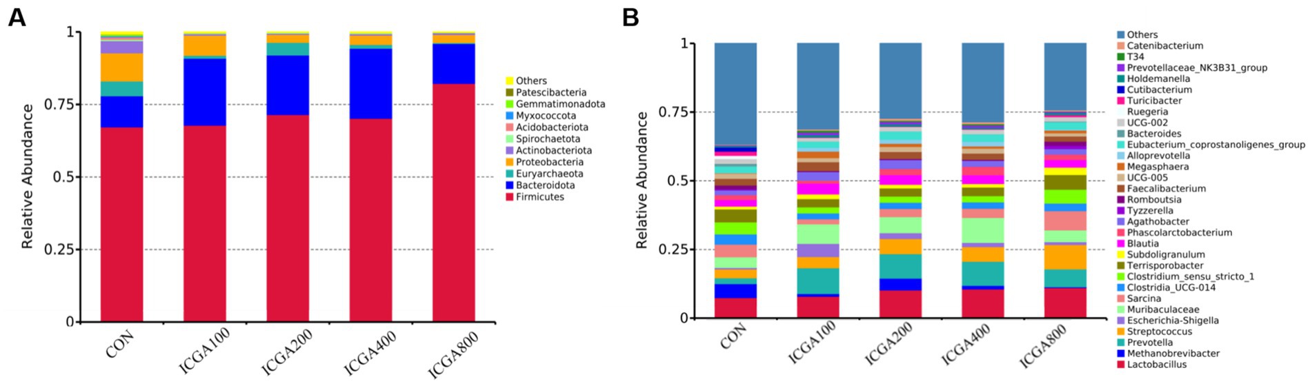 Colonic digesta samples (n = 30) were collected from pigs assigned to five dietary treatments: control, 100 mg/kg ICGA, 200 mg/kg ICGA, 400 mg/kg ICGA, and 800 mg/kg ICGA, with six animals per group. To profile the resident microbiota, the V3–V4 hypervariable region of the bacterial 16S rRNA gene was amplified and sequenced. Sample preparation, DNA extraction and validation, PCR amplification, product purification, library construction and quality assessment, as well as high-throughput sequencing using the NovaSeq platform, were performed by Beijing Novogene Biotechnology Co., Ltd.