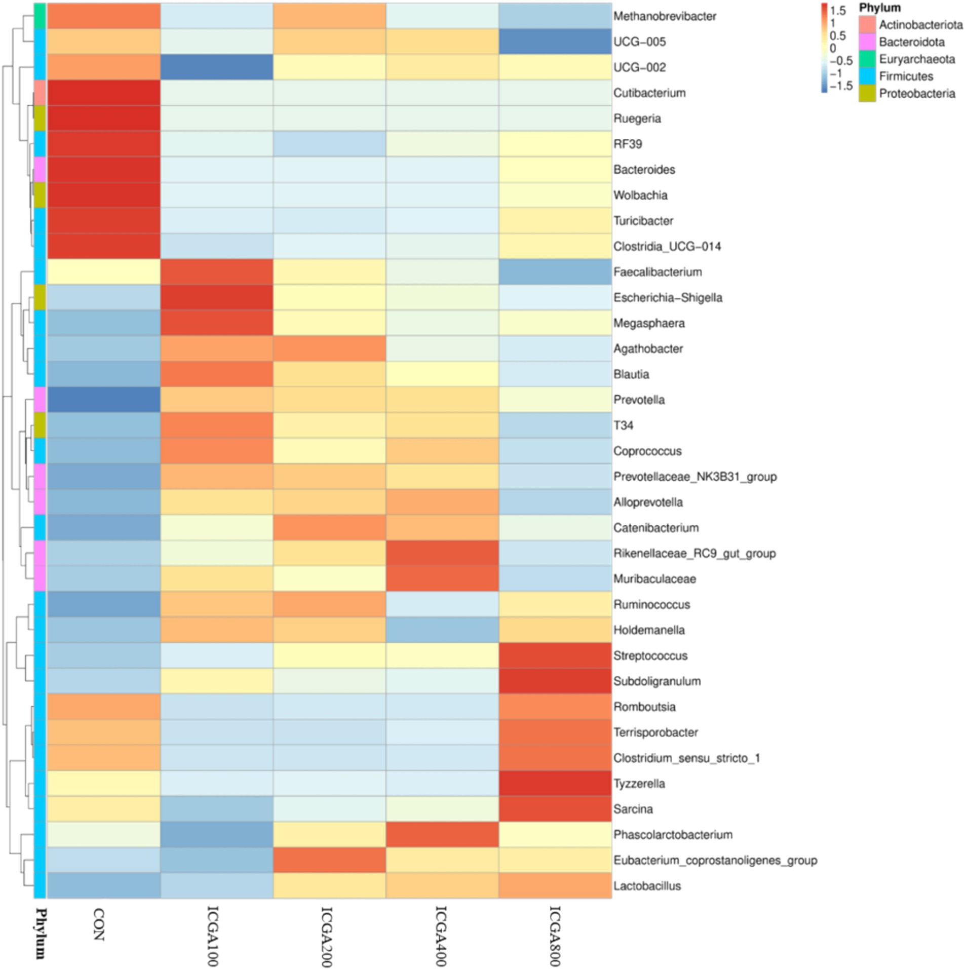 Figure 2. Heatmap of top 35 genera (relative abundances) among the groups. Values are the means (n = 6 replicates per treatment).