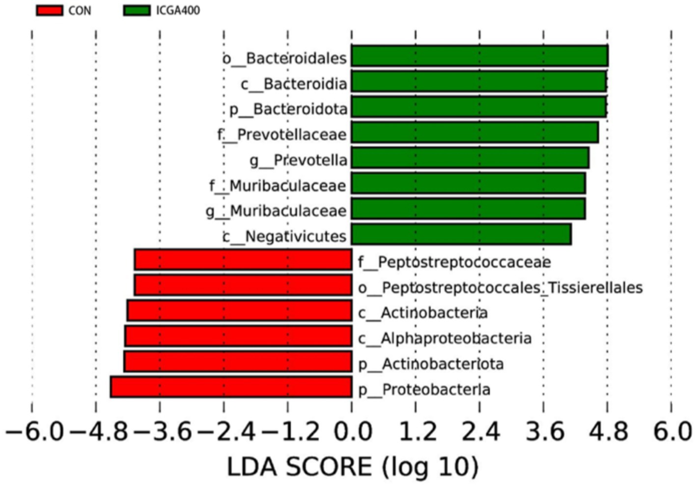 Figure 3. Linear discriminant analysis (LDA) scores (>4.0) computed for features at the ASV level. Letters represented the taxonomy of the bacteria: p, phylum, c, class; o, order; f, family; g, genus. All the values contained 6 repetitions. ICGA400 = 400 mg/kg isochlorogenic acid. Values are the means (n = 6 replicates per treatment).