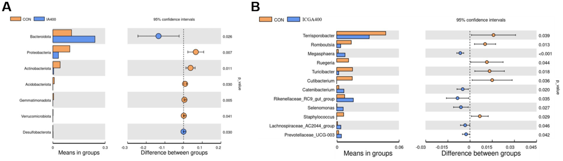 T-test can be used to find species with significant differences between groups at each taxonomic level. (Figures 4A,B). ICGA400 treatments enhanced the Bacteroides (p < 0.05) in contrast to the CON group, while Proteobacteria (p < 0.01), Actinobacteriota (p < 0.05), Acidobacteriota (p < 0.05), Gemmatimonadota (p < 0.01), and Verrucomicrobiata (p < 0.05) decreased notably. Compared with the CON group, Terrisporobacter (p < 0.05), Romboutsia (p < 0.05), Ruegeria (p < 0.05), Turicibacter (p < 0.05), Cutibacterium (p < 0.05), and Staphylococcus (p < 0.05) showed a dramatic reduction in the ICGA400 group, while the Megasphaera (p < 0.01), Catenibacterium (p < 0.05), Rikenellaceae_RC9_gut_group (p < 0.05), Selenomonas (p < 0.05), Lachnospiraceae_AC2044_group (p < 0.05), and Prevotellaceae_UCG-003 (p < 0.05) increased significantly.