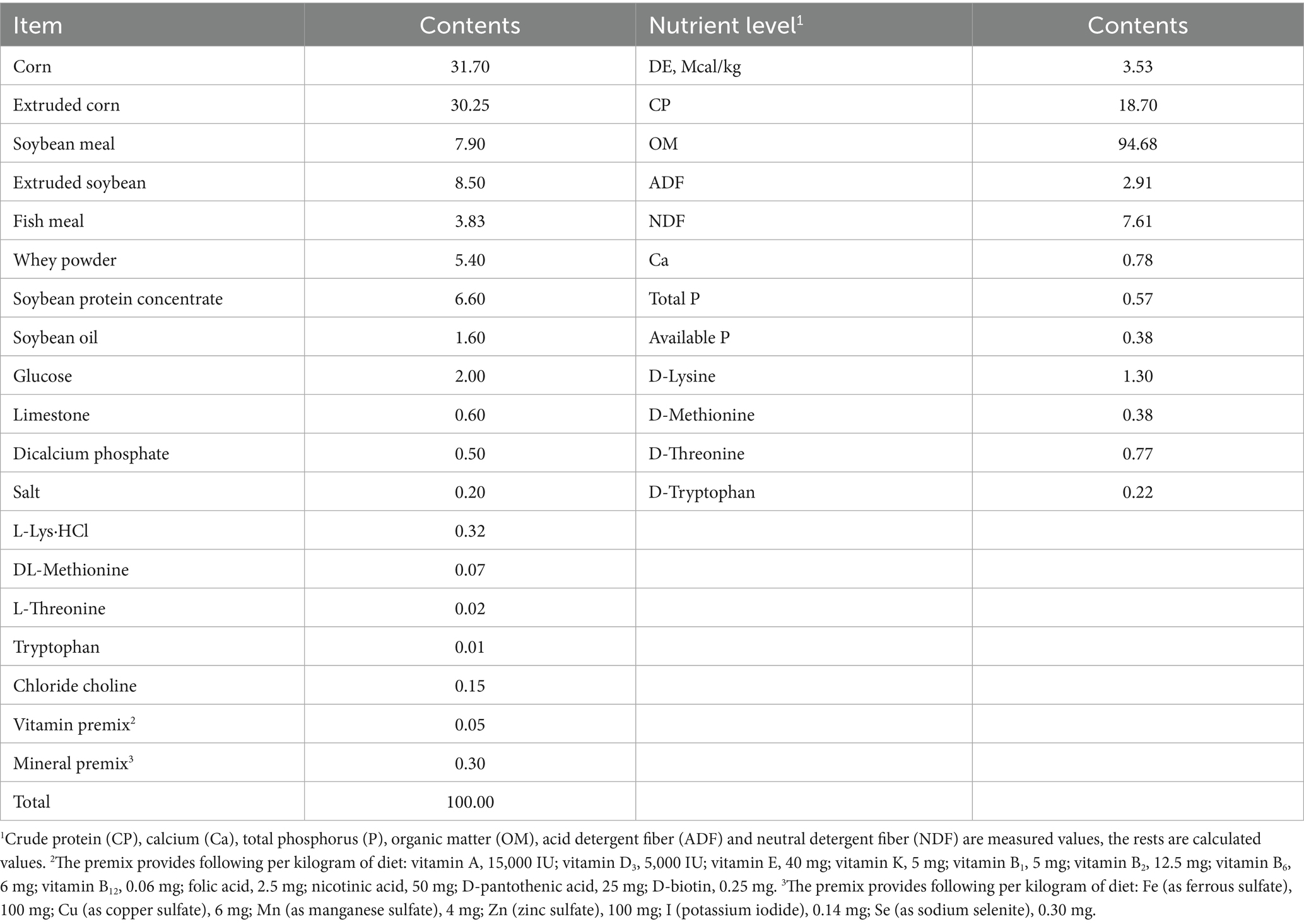The piglets were monitored daily to assess their health status throughout the experiment. Daily feed intake for each pen was recorded, and the average daily feed intake (ADFI) was calculated. The body weight of fasted piglets was measured on days 1, 15, and 29 of the trial to determine the average daily gain (ADG) and feed-to-gain ratio (F: G). To evaluate the incidence and severity of diarrhea, fecal consistency was scored on a 0 to 3 scale: 0 = normal, firm feces; 1 = soft feces, potential slight diarrhea; 2 = unformed, moderately fluid feces; and 3 = very watery, frothy diarrhea. Diarrhea was defined as a score of 2 or greater. The diarrhea rate and diarrhea index were calculated as follows: diarrhea rate (%) = (number of piglets with diarrhea per pen × days of diarrhea) / (total number of piglets × 28 days) × 100, and diarrhea index = sum of diarrhea scores per pen/(number of piglets per pen × total days) (17).