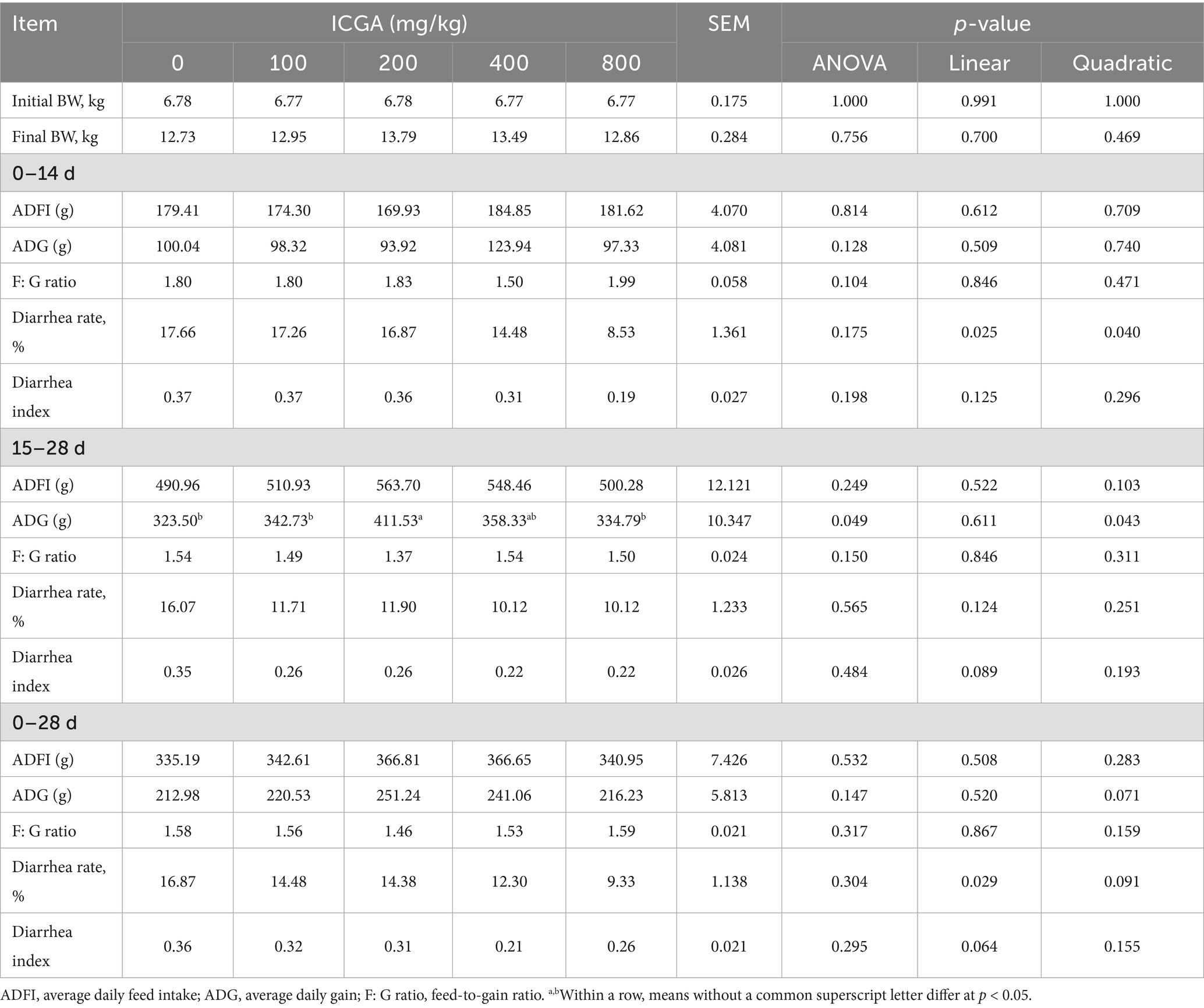 Table 2. Effects of isochlorogenic acid (ICGA) supplementation on growth performance, diarrhea rate and diarrhea index in weaned piglets.
