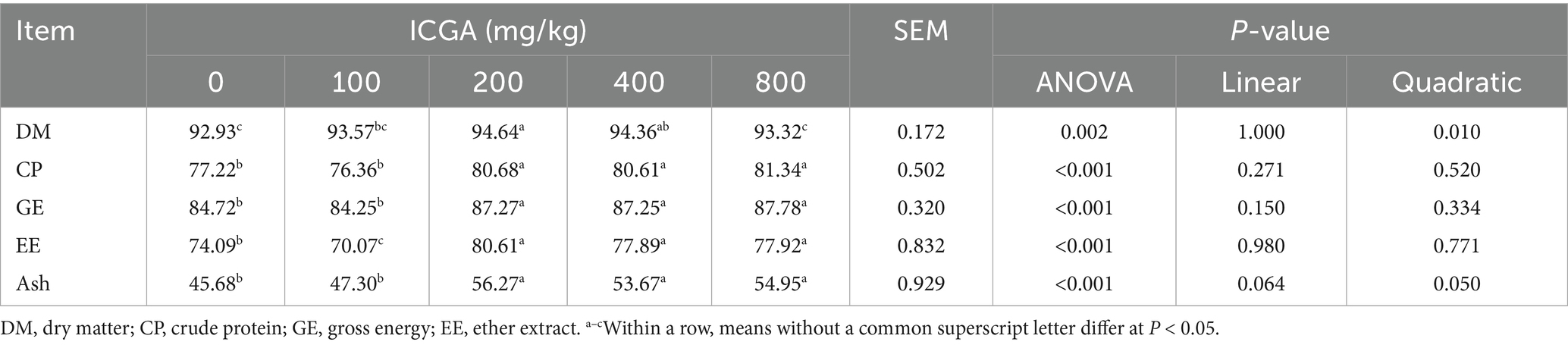 As shown in Table 3, Relative to the CON group, pigs receiving 200 or 400 mg/kg ICGA exhibited significantly improved apparent total tract digestibility (ATTD; p < 0.01) of dry matter (1.84 and 1.54%, respectively), crude protein (4.48 and 4.39%), gross energy (3.01 and 2.99%), ether extract (23.18 and 17.49%), and ash (8.80 and 5.13%).