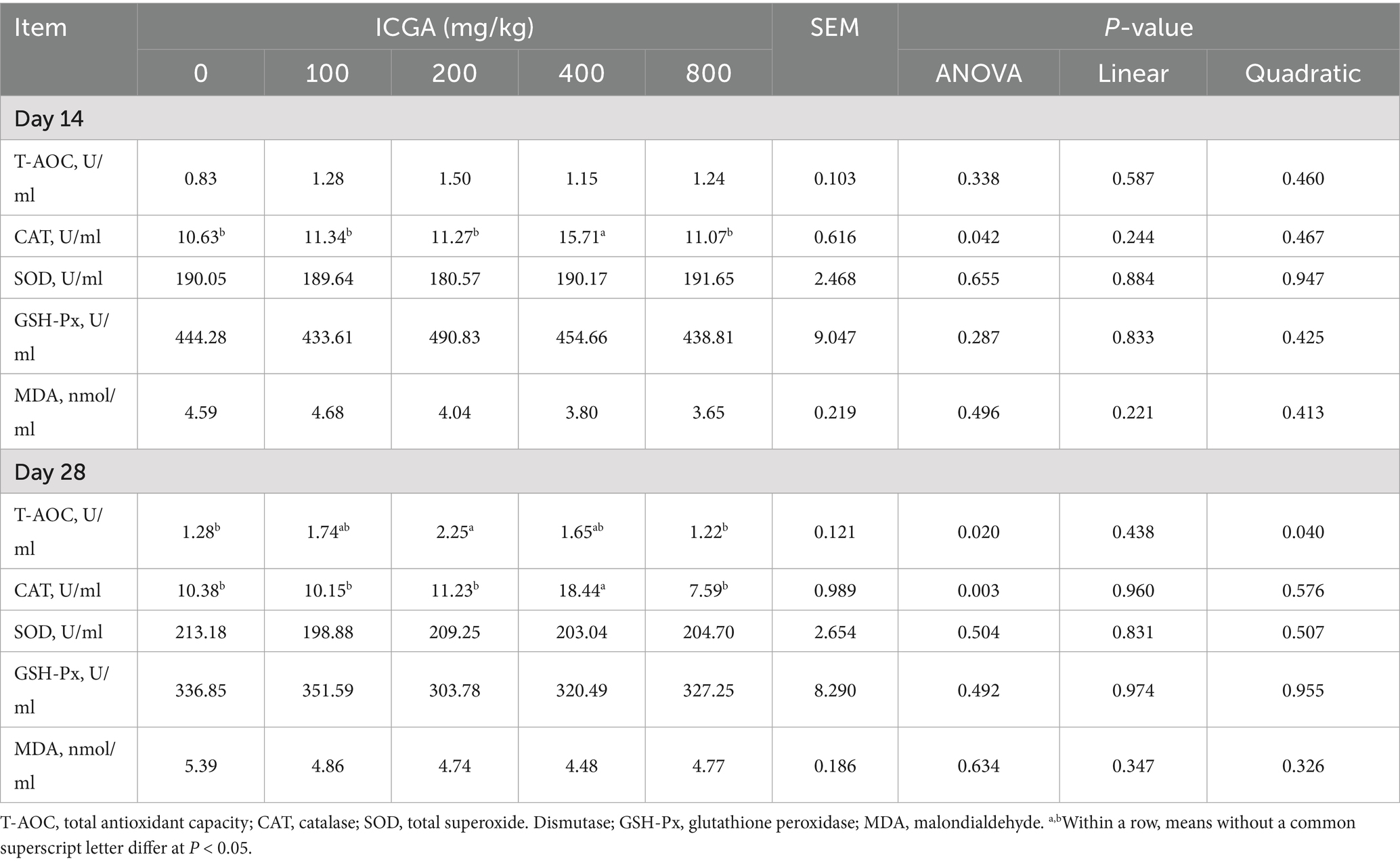 The effects of dietary ICGA supplementation on serum anti-oxidation are shown in Table 4. On day 14, the 400 mg/kg ICGA group showed a 47.78% increase in serum catalase (CAT) activity compared with the CON group (p < 0.05), which further increased to 77.65% by day 28 (p < 0.05). Meanwhile, supplementation with 200 mg/kg ICGA elevated serum total antioxidant capacity (T-AOC) by 75.78% on day 28 (p < 0.05), demonstrating a significant quadratic dose–response relationship (p < 0.05).
