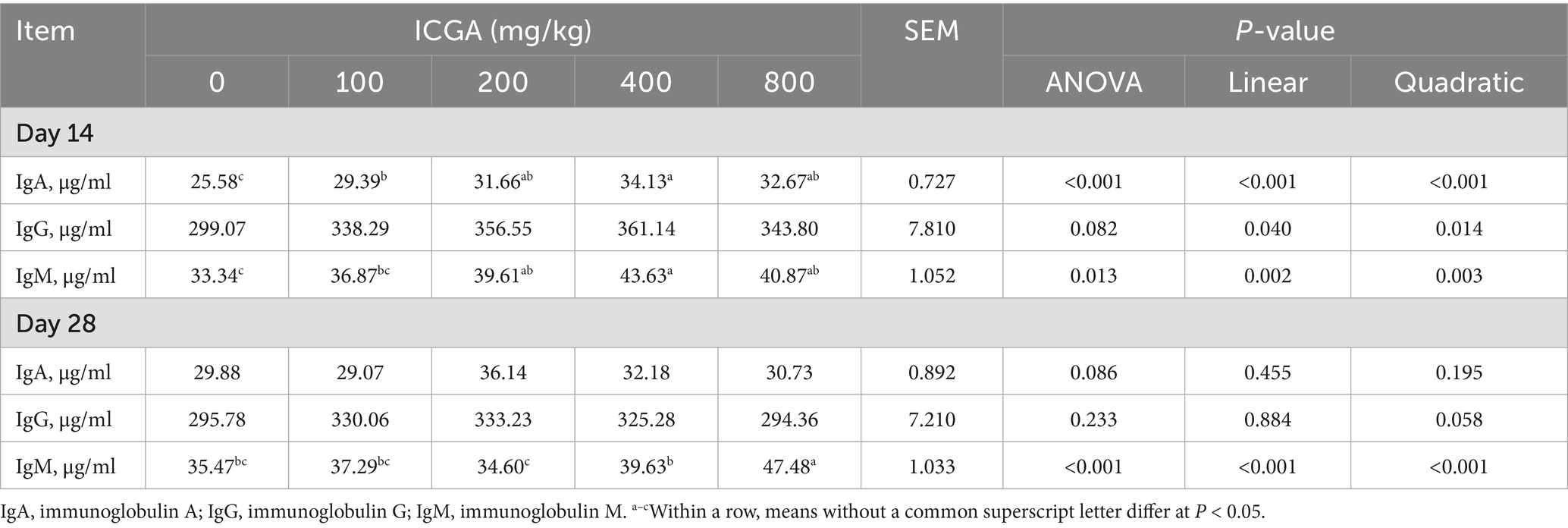 Table 5. Effects of isochlorogenic acid (ICGA) supplementation on immunoglobulins in serum of piglets.