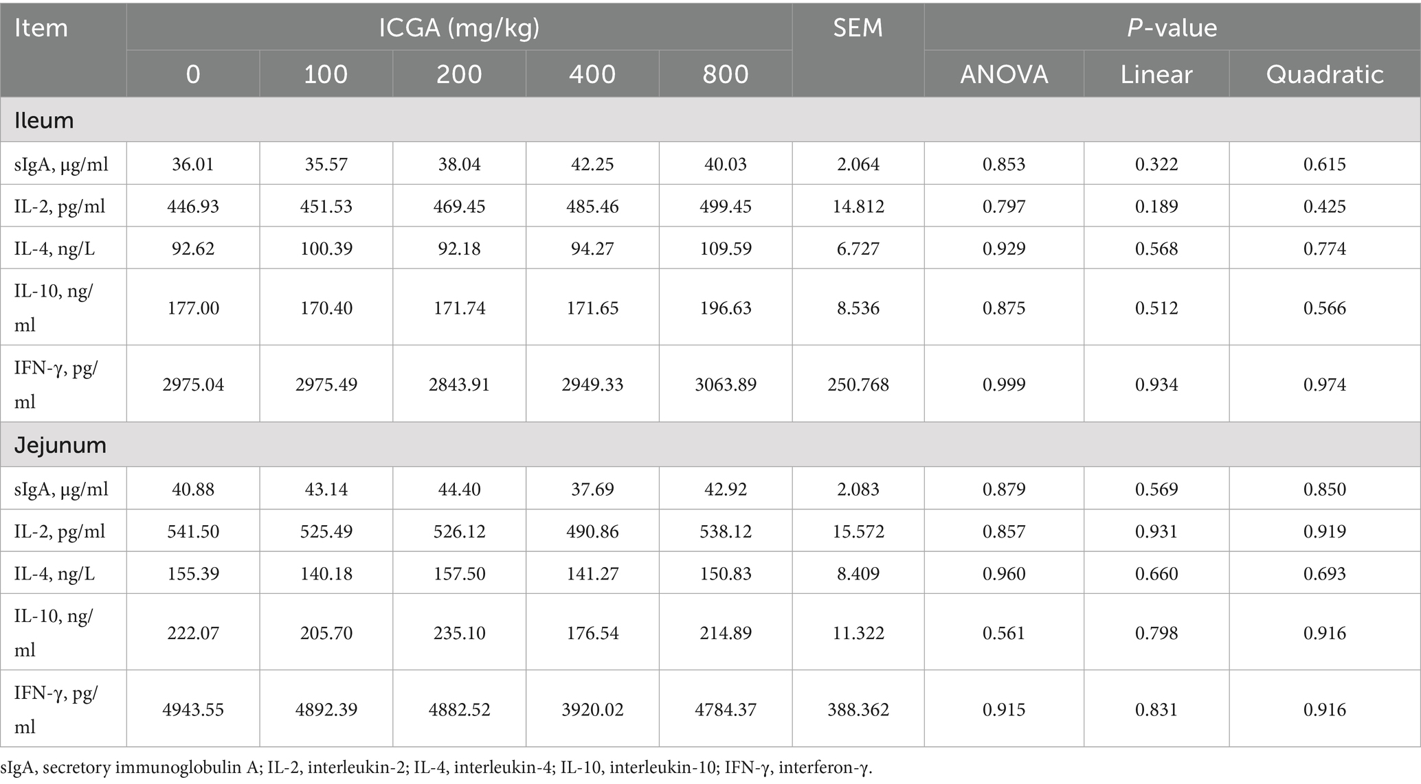 The effects of dietary ICGA supplementation on immunoglobulins in serum are shown in Table 5. At day 14, serum immunoglobulin A (IgA) levels increased by 23.77 and 33.42%, and immunoglobulin M (IgM) by 18.81 and 30.86%, in the 200 and 400 mg/kg ICGA groups, respectively (p < 0.01). Immunoglobulin levels exhibited a significant quadratic relationship with ICGA dose (p < 0.01), peaking at 400 mg/kg. The effects of dietary ICGA supplementation on cytokines in intestinal mucosa are shown in Table 6. Obviously, no differences were observed for sIgA, IL-2, IL-4, IL-10, and IFN-γ in ileal and jejunal mucosa of weaned piglets among the 5 dietary treatments (p > 0.05).