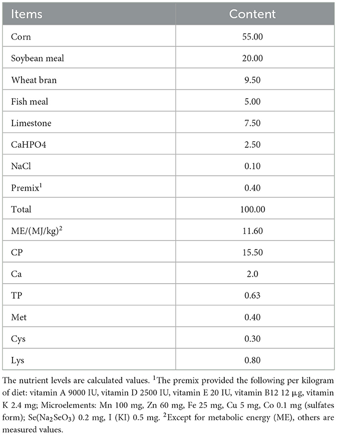 This research was carried out in the poultry housing facility of Guangdong Ocean University's Animal Hospital (located in Zhanjiang, China). All protocols involving animals were reviewed and approved by the Institutional Animal Ethics Committee of the same institution. Environmental conditions, including temperature and humidity levels, were maintained using heating lamps and dehumidifiers. The normal temperature group (25 ± 1°C) and the high temperature group (cyclic high temperature of 32 ± 1°C for 8 h daily from 9:00 to 17:00) were established, with humidity maintained at 55%−70% in each group. The trial consisted of a 14-day pre-trial period (weeks 26–27) and a 28-day formal trial period (weeks 28–31). During the pre-trial period, all chickens were fed the basal diet under uniform conditions without selection. Six groups were randomly assigned to 216 healthy 26-week-old Huaixiang hens: the NC group (25 ± 1°C, basal diet), the HC group (32 ± 1°C for 8 h/day, basal diet), and four HCX groups (32 ± 1°C for 8 h/day, basal diet supplemented with 4, 6, 8, or 10 mg/kg CX). The specific grouping is shown in Table 1. The four supplementation levels of canthaxanthin (4, 6, 8, and 10 mg/kg) were selected to establish a comprehensive dose-response relationship. The central dose of 6 mg/kg was chosen based on its proven efficacy in enhancing the antioxidant status of poultry as reported by Zhang et al. (10). The lower (4 mg/kg) and higher (8, 10 mg/kg) doses were included to identify potential sub-optimal, optimal, and plateau effects. All experimental doses were well below the maximum authorized level of 30 mg/kg for laying hens stipulated in Commission Regulation (EU) 2015/1486 (11), ensuring both safety and regulatory compliance. All animal feeds were formulated according to the Chinese agricultural industry standard NY/T 33-2004 for poultry nutrition requirements, with the primary ingredients being corn and soybean-based protein sources. The detailed feed composition is provided in Table 2.