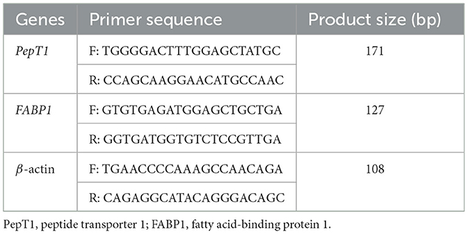 Jejunum samples weighing 50 mg were transferred into nuclease-free homogenization tubes (2.5 ml capacity), followed by the addition of 500 μl cell lysis solution (EZB-RN001, EZBioscience, USA). After complete lysis, RNA was purified through chromatography columns, washed, eluted, and extracted (Vazyme Biotech Co., Ltd., Jiangsu, China). RNA purity was assessed by measuring the absorbance ratio (A260/A280) using a spectrophotometer. Reverse transcription was performed with a commercial kit (Vazyme Biotech Co., Ltd.) to synthesize cDNA (21). Gene-specific primers (sequences shown in Table 3) were synthesized by Guangzhou Ruijie Biological Co., Ltd. Gene expression levels were quantified through quantitative real-time PCR (qPCR) analysis in 20 μl reactions containing synthesized cDNA templates. The thermal cycling protocol included an initial 2-min denaturation at 95°C, followed by 15-s denaturation at 95°C and 30-s annealing at 60°C, for 40 cycles (Bio-Rad, Hercules, CA, USA). Three biological replicates were analyzed for each sample, with β-actin serving as the reference gene for normalization. Relative gene expression was determined by applying the comparative CT (2−ΔΔCT) calculation method.