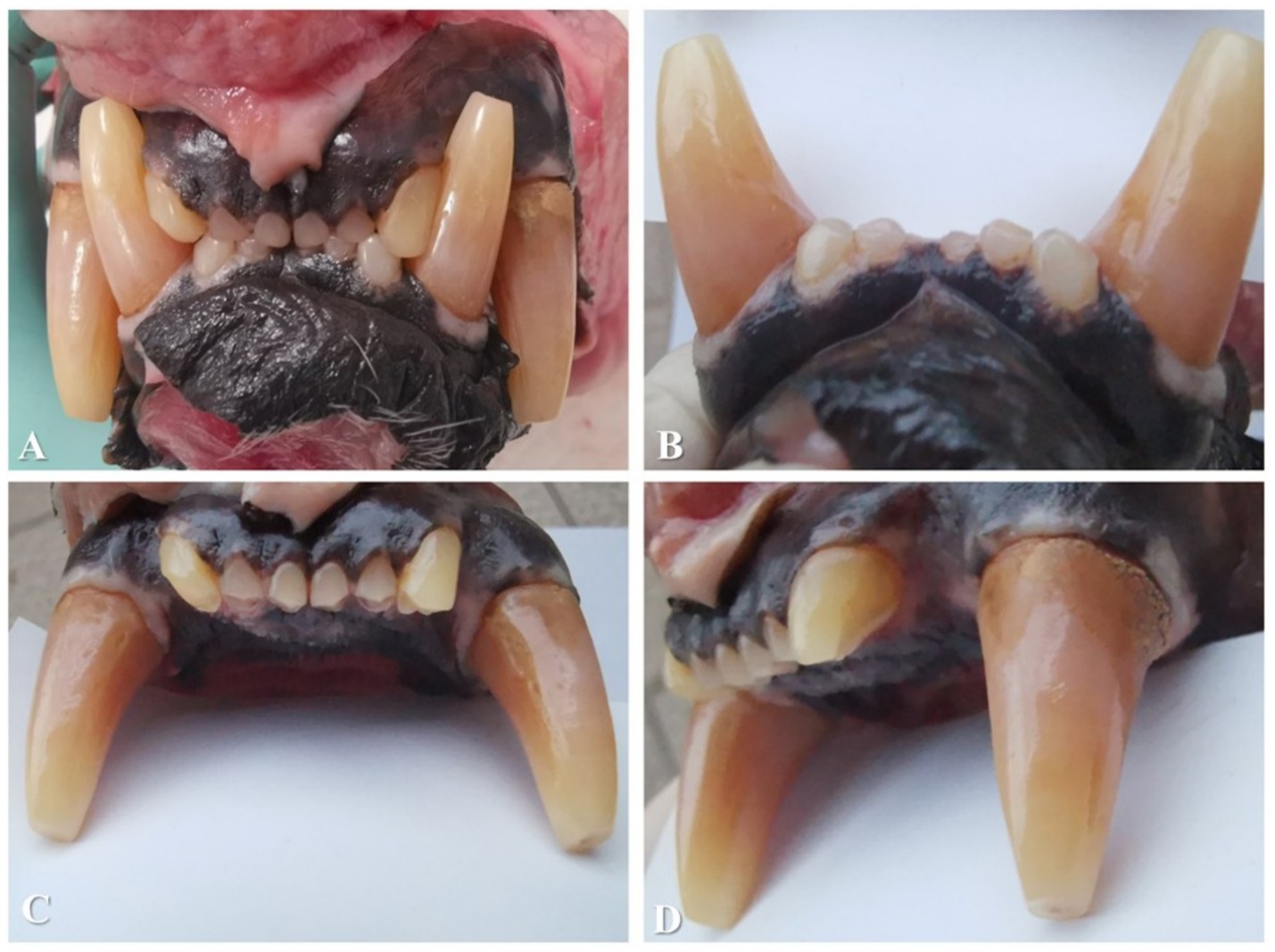 Figure 1. (A) Rostral view of the bite. Note the occlusal edge contact between the incisor teeth, the orange-pink colour of the canine teeth, and dental attrition. The pink appearance visible in some incisors in these images resulted from illumination and not from true intravitam discolouration of the dental tissue. (B) Buccal view of the mandibular incisor and canine teeth. Note the normal colour of the incisor teeth compared to a blank page that is positioned caudally to them for comparison. (C) Buccal view of the maxillary incisor and canine teeth. (D) View from the left maxillary incisor and canine teeth showing normal colouration of the incisor teeth.
