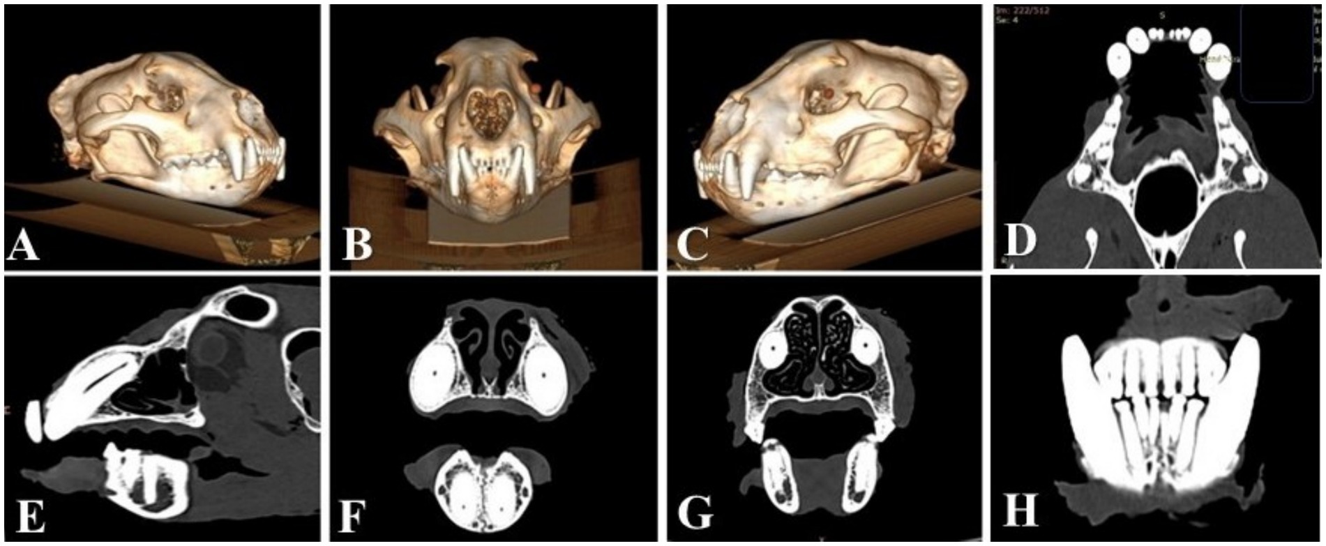 Figure 2. (A) 3D reconstruction of the skull—right lateral view of the skull. (B) 3D reconstruction of the skull—oro-aboral view of the skull. (C) 3D reconstruction of the skull—left lateral view of the skull. (D) Dorsal CT image of the bone window reveals similar dimensions of the pulp cavities in all four canine teeth. (E) Sagittal CT image of 104, revealing the pulp cavity with no periapical pathologies or bone window. (F) Transverse CT images of the four canines were used to compare the dimensions of the pulp cavities. All four canines have similar dimensions of the pulp cavities, with no abnormalities or bone windows. (G) Transverse CT image through the roots of the maxillary canine teeth for comparison, showing similarities in the dimensions of the pulp cavities and the bone window. (H) Transverse CT image that enables visualization of the 401 root remnant.